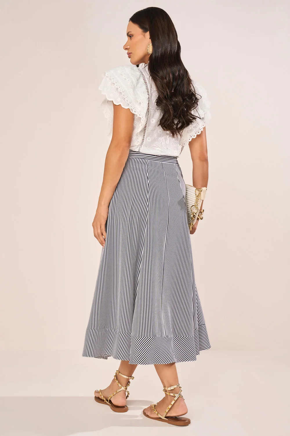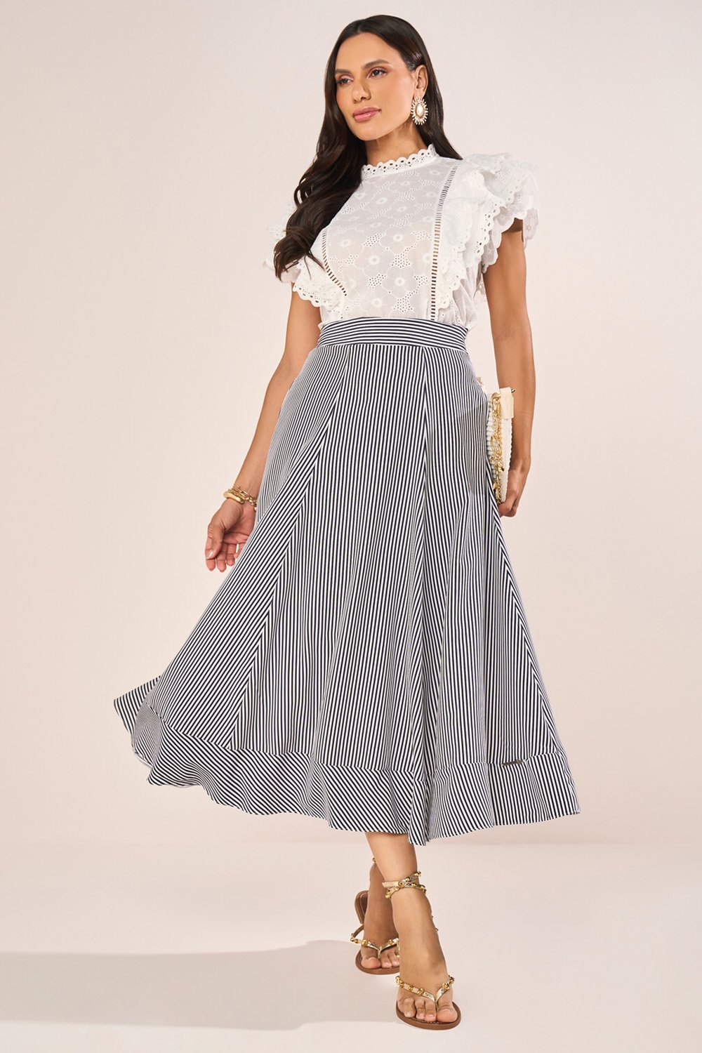 LANÇAMENTOFRETEGRÁTISENVIOIMEDIATOSaia Azul Com Listras E Bolsos Frontais Evasê Midi FasciniusR$ 427,71 no PIX