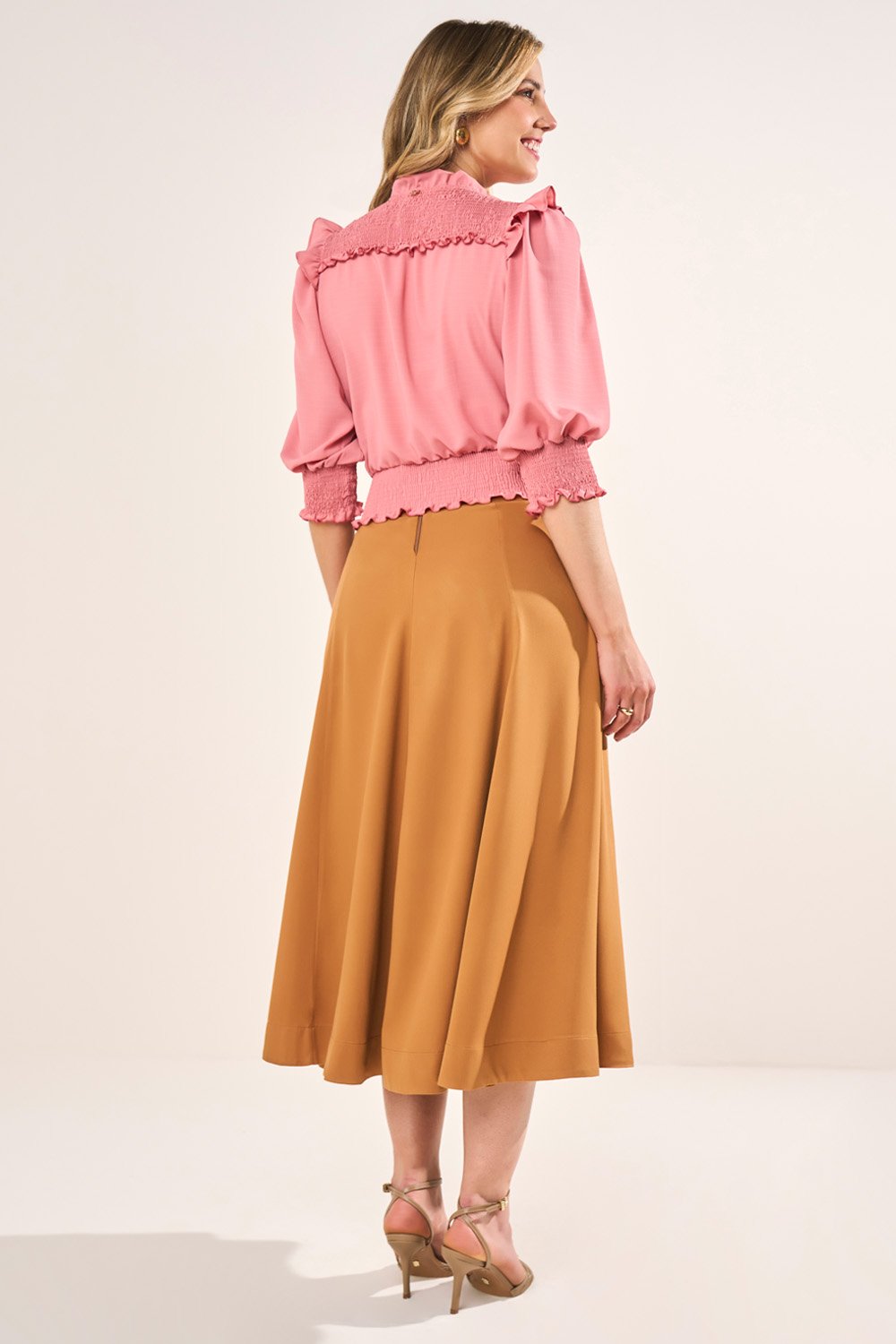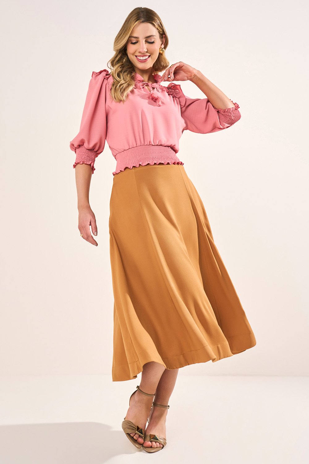 Produzida em crepe fluido com textura suave, garante frescor e leveza ao vestir. O caimento delicado realça os detalhes da peça, enquanto o forro e o acabamento com lastex proporcionam conforto extra durante o uso.