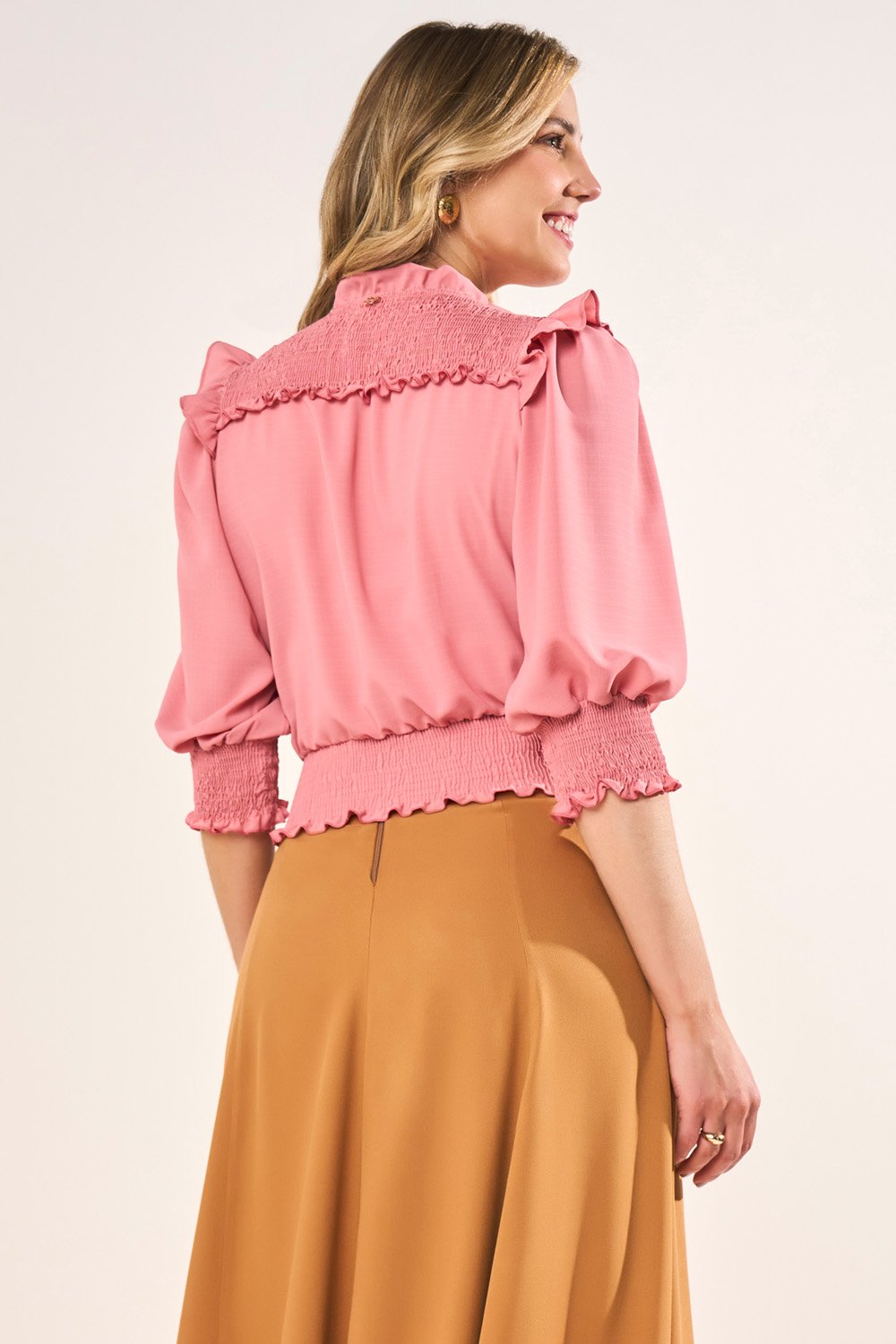 Essa blusa é puro romantismo e conforto. Com pala, punhos e cós em lastex, ela se ajusta perfeitamente ao corpo. O decote V com babadinhos e amarração com pompons traz um toque divertido e delicado à composição. Ideal para quem ama um visual leve e encantador.