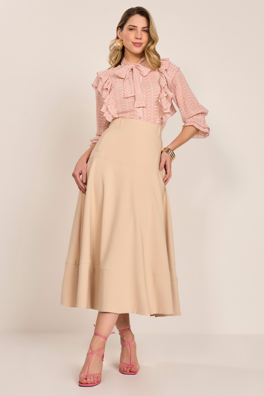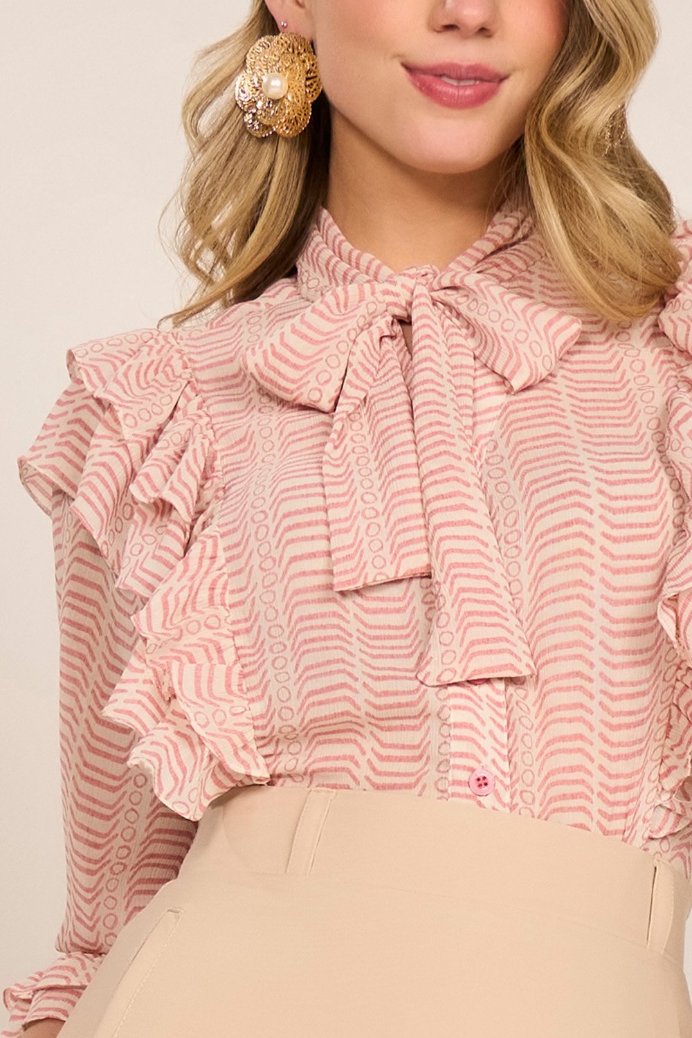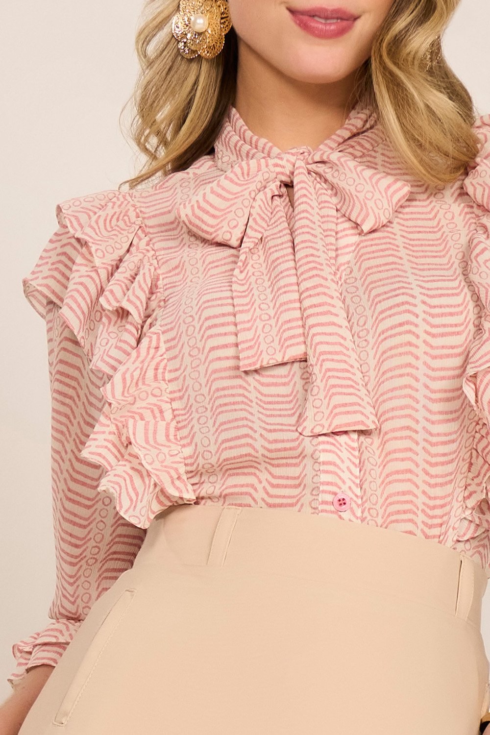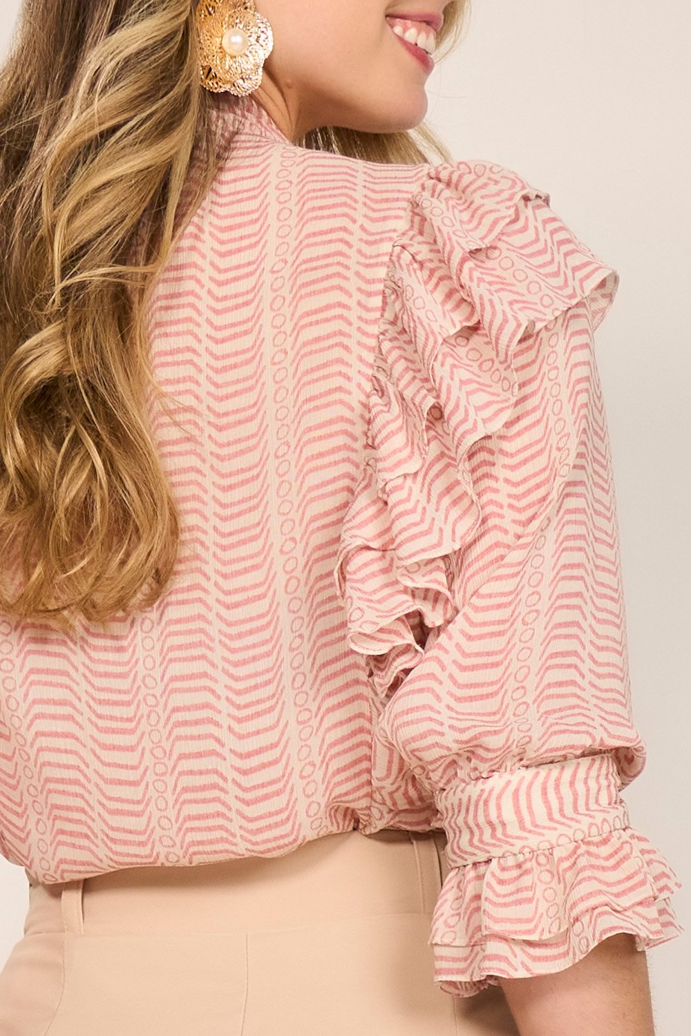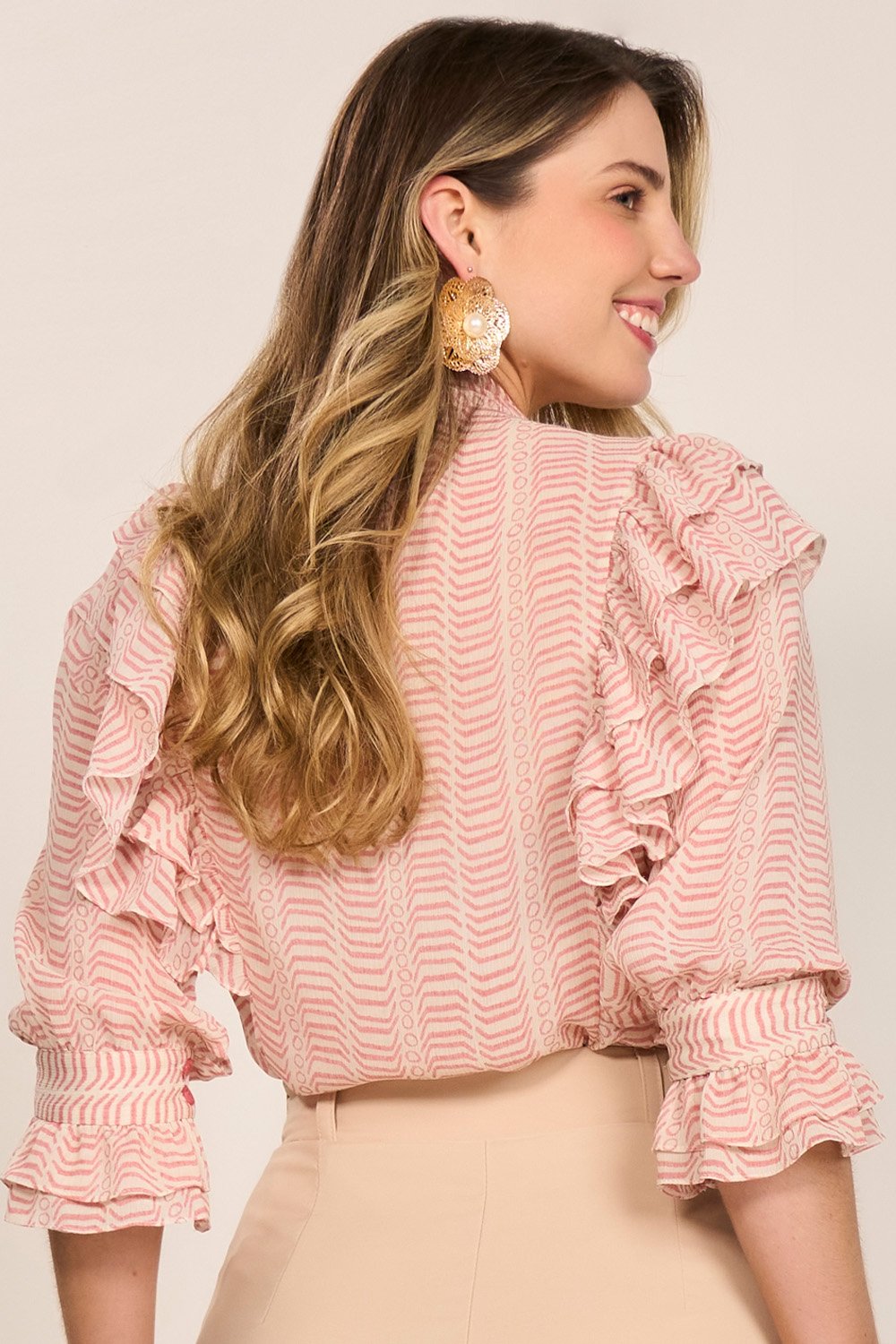 Os babados nos recortes elevam o visual com suavidade e elegância. A estrutura das mangas e os detalhes bem finalizados tornam a peça versátil para diversas ocasiões – desde um look de trabalho até composições mais sofisticadas para eventos.