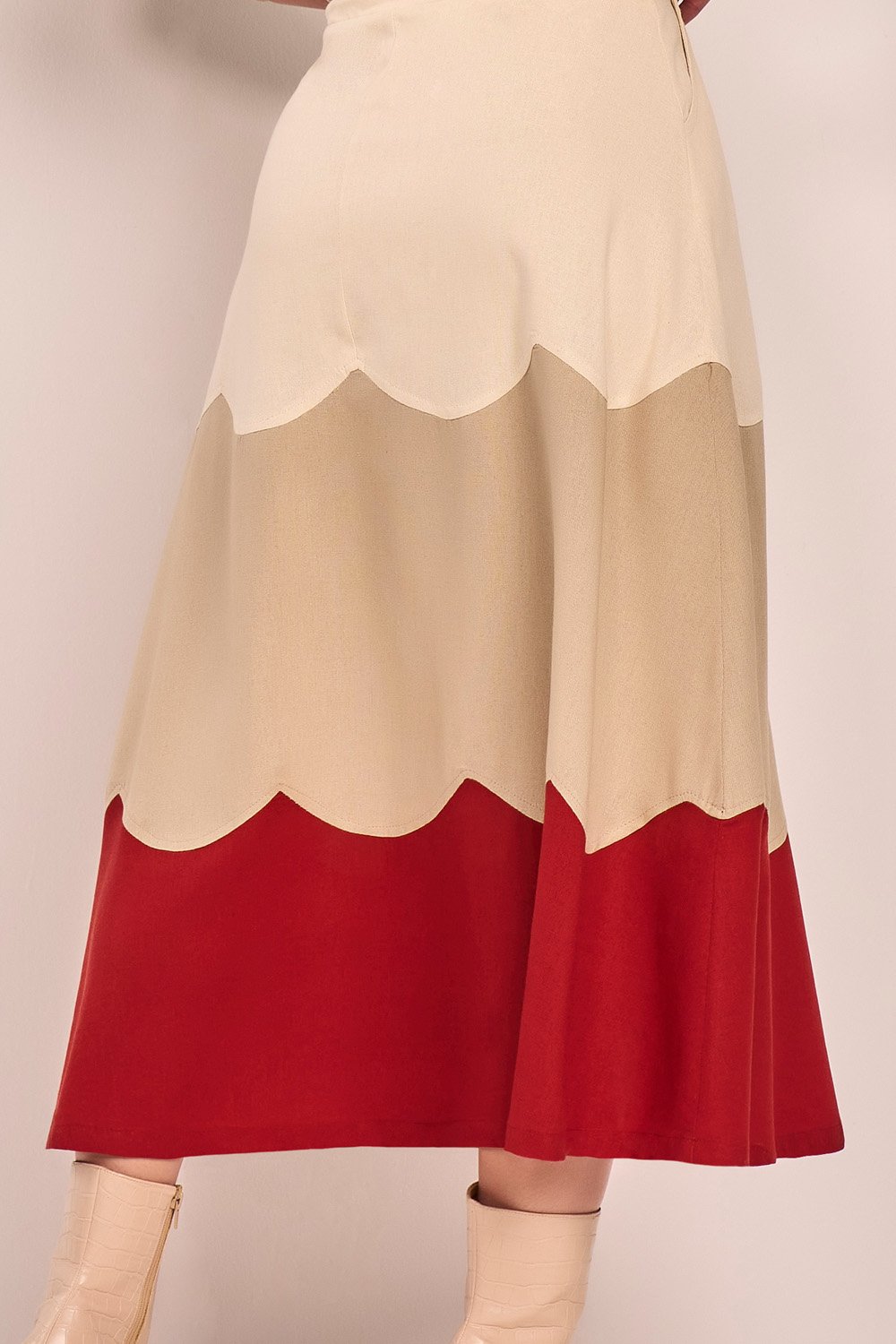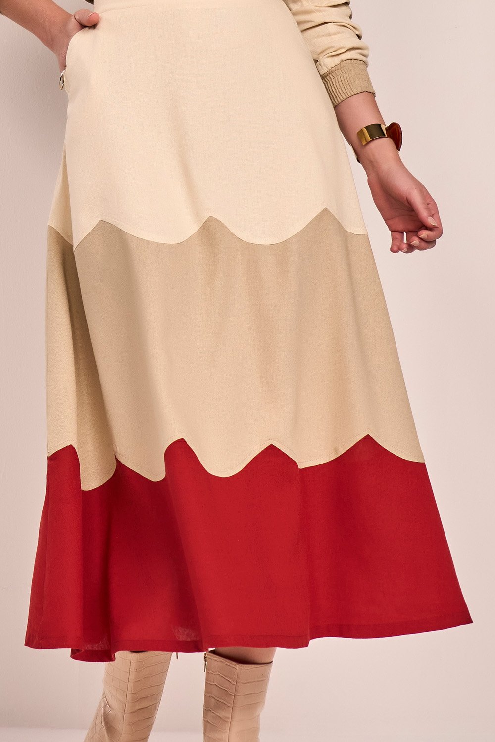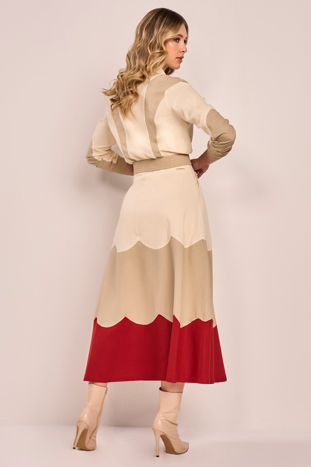 Os recortes curvados na saia criam um efeito visual dinâmico e exclusivo. O cós e os punhos com elástico garantem conforto sem comprometer a estrutura. Saia com forro, fechamento lateral por zíper. Um conjunto leve, versátil e cheio de identidade.