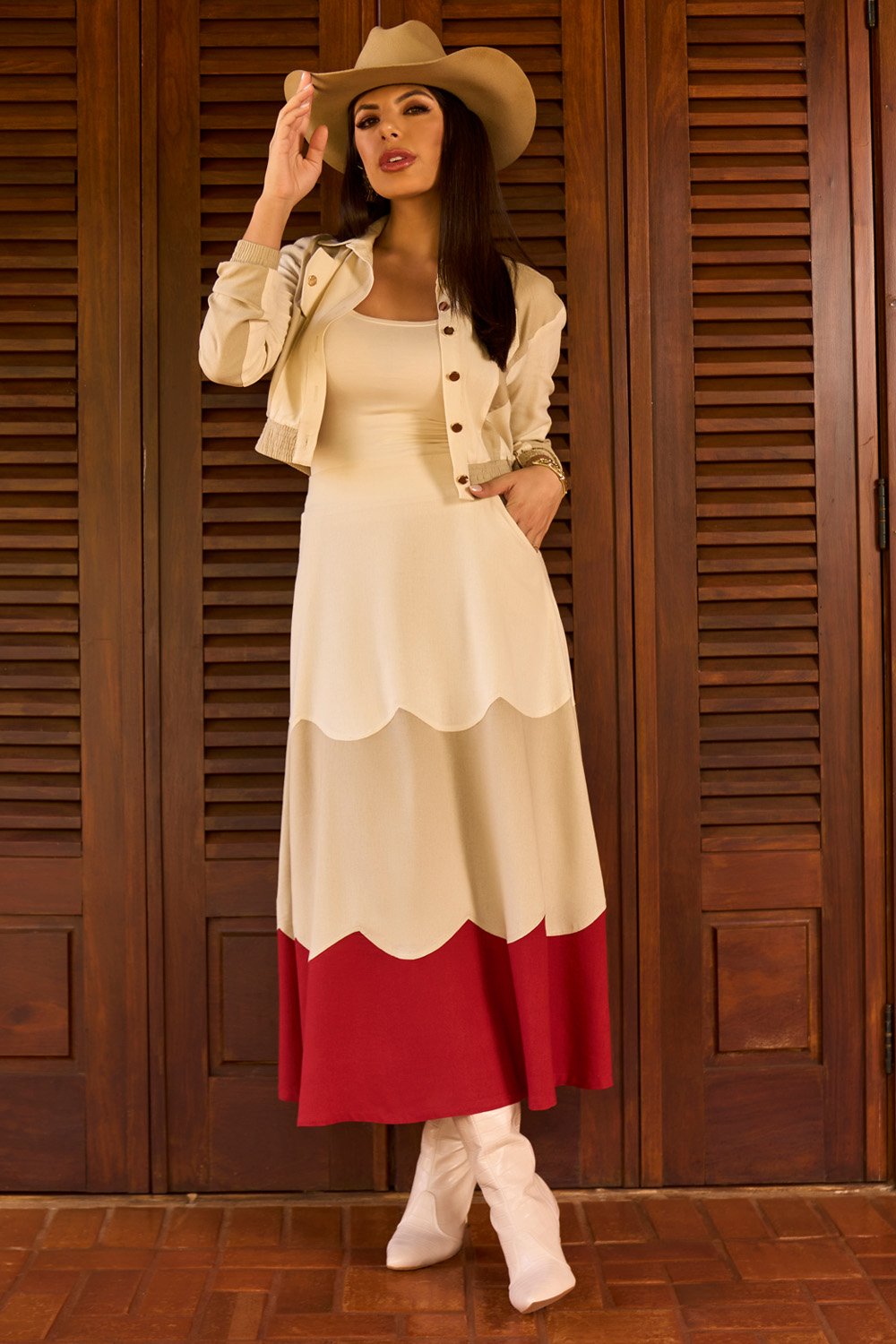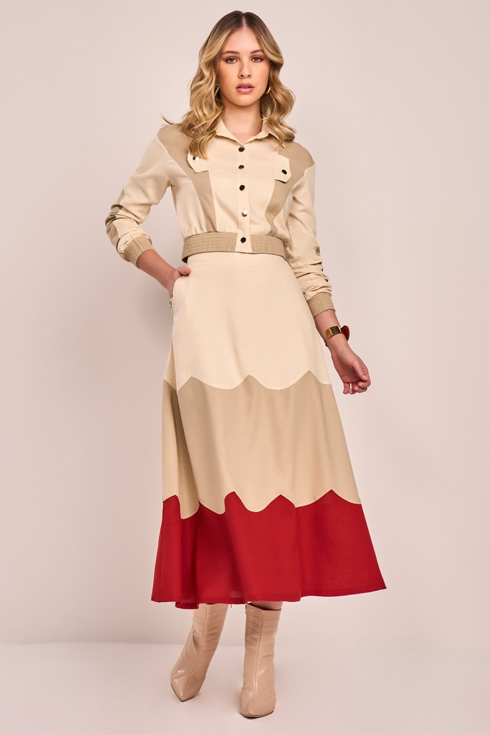 Um conjunto moderno e criativo que une cortes estratégicos, contraste de cores e estilo casual chic. O casaqueto valoriza a parte superior com lapelas, botão em metal e punhos com elástico. A saia com recortes curvados e modelagem evasê completa o visual com leveza e sofisticação.