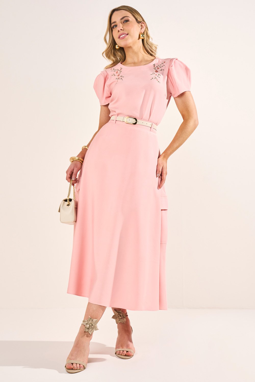 -20%FRETEGRÁTISENVIOIMEDIATOConjunto Rosa T-Shirt Com Pérolas E Saia Com Flores Godê Midi Fasciniusde R$ 719,90 porR$ 535,61 no PIX