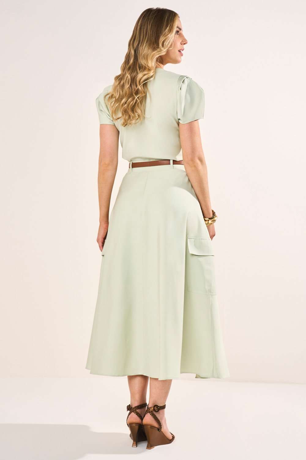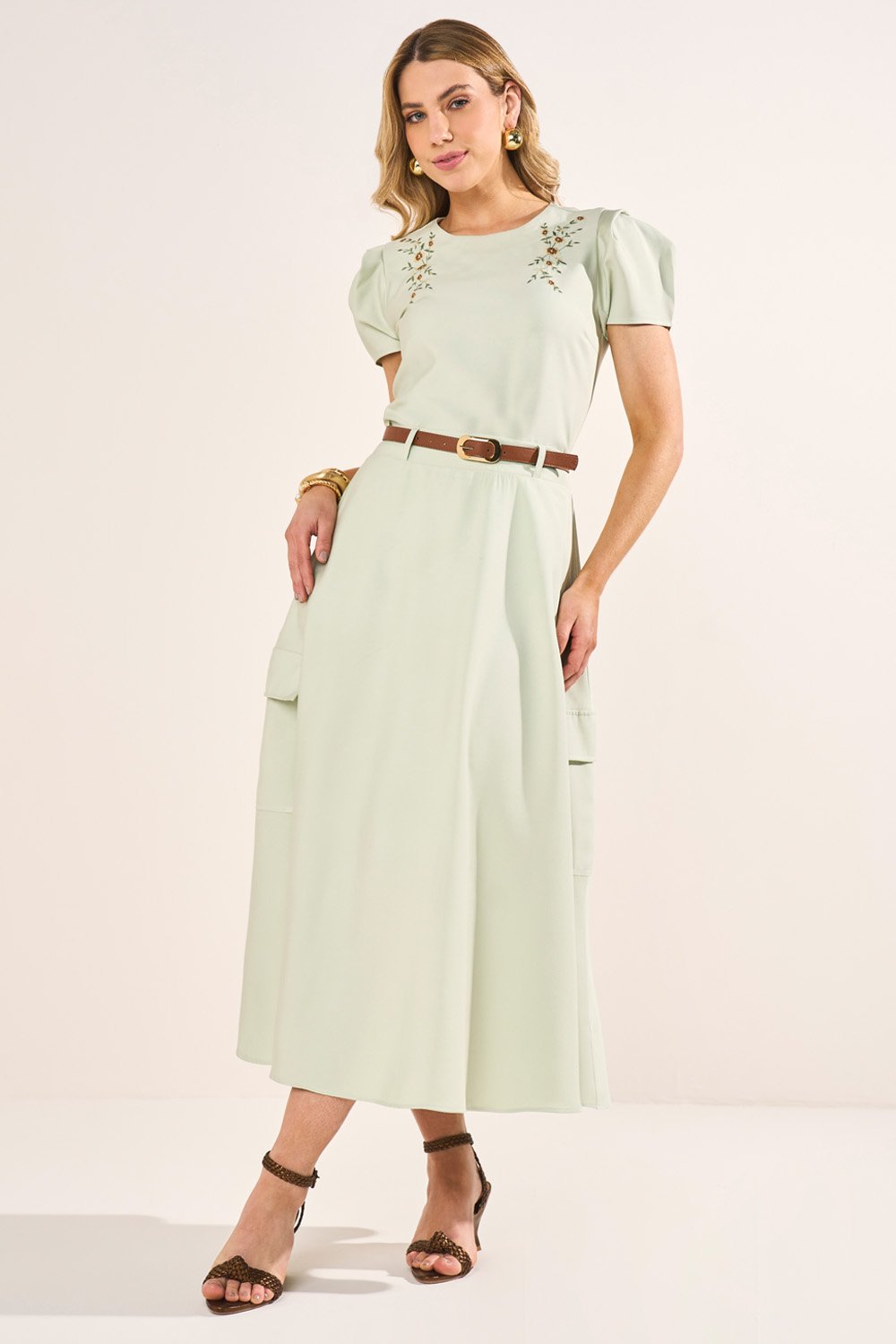 -30%FRETEGRÁTISENVIOIMEDIATOConjunto Verde T-Shirt Com Pérolas E Saia Com Flores Godê Midi Fasciniusde R$ 719,90 porR$ 468,65 no PIX