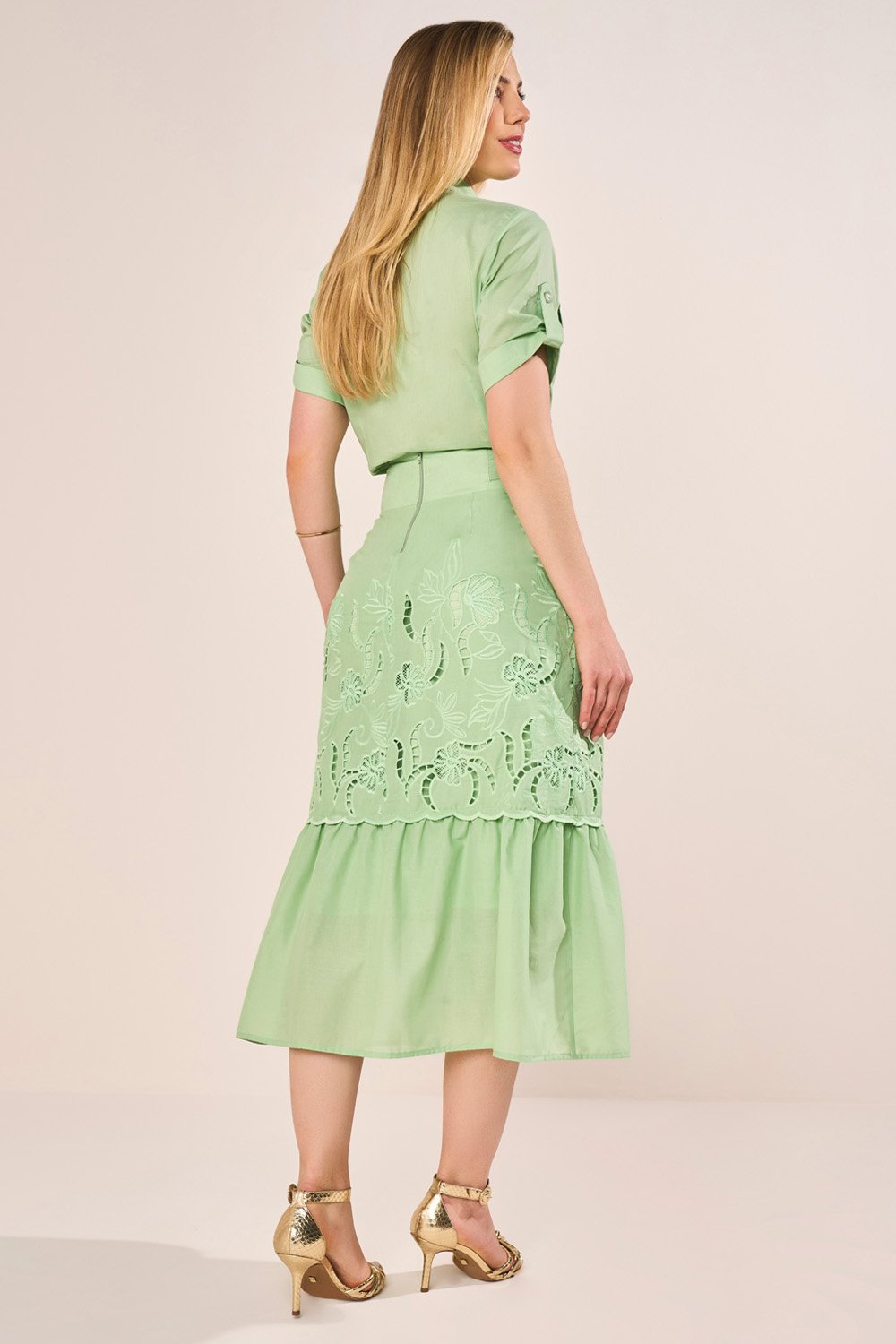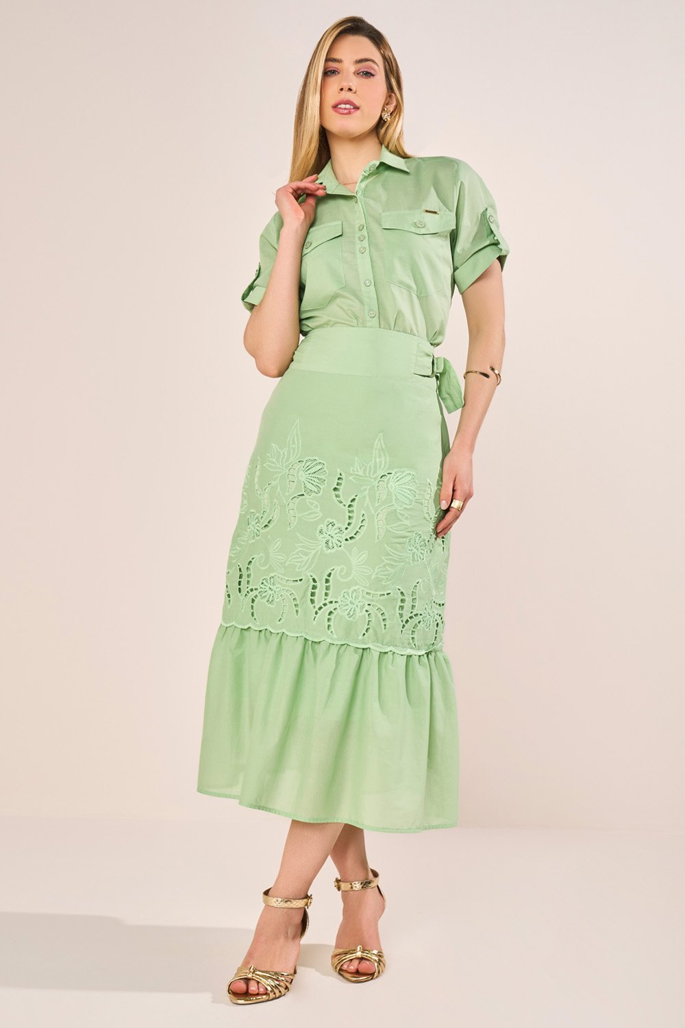 O bordado Richelieu, minuciosamente aplicado, se destaca como protagonista da composição, trazendo um toque artesanal de alta sofisticação. As fivelas laterais no cós da saia formam um detalhe moderno e inusitado, complementando com elegância a estrutura da peça. Os bolsos da camisa, adornados com botões, acrescentam charme funcional e equilibram a estética clássica com sutileza contemporânea. Cada elemento foi pensado para criar um conjunto marcante, versátil e irresistivelmente refinado.