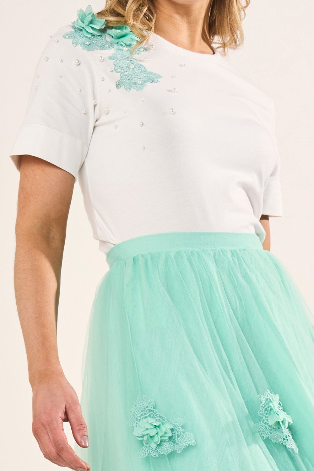 -30%FRETEGRÁTISENVIOIMEDIATOConjunto Rosa T-Shirt Com Pérolas E Saia Com Flores Godê Midi Fasciniusde R$ 719,90 porR$ 468,65 no PIX