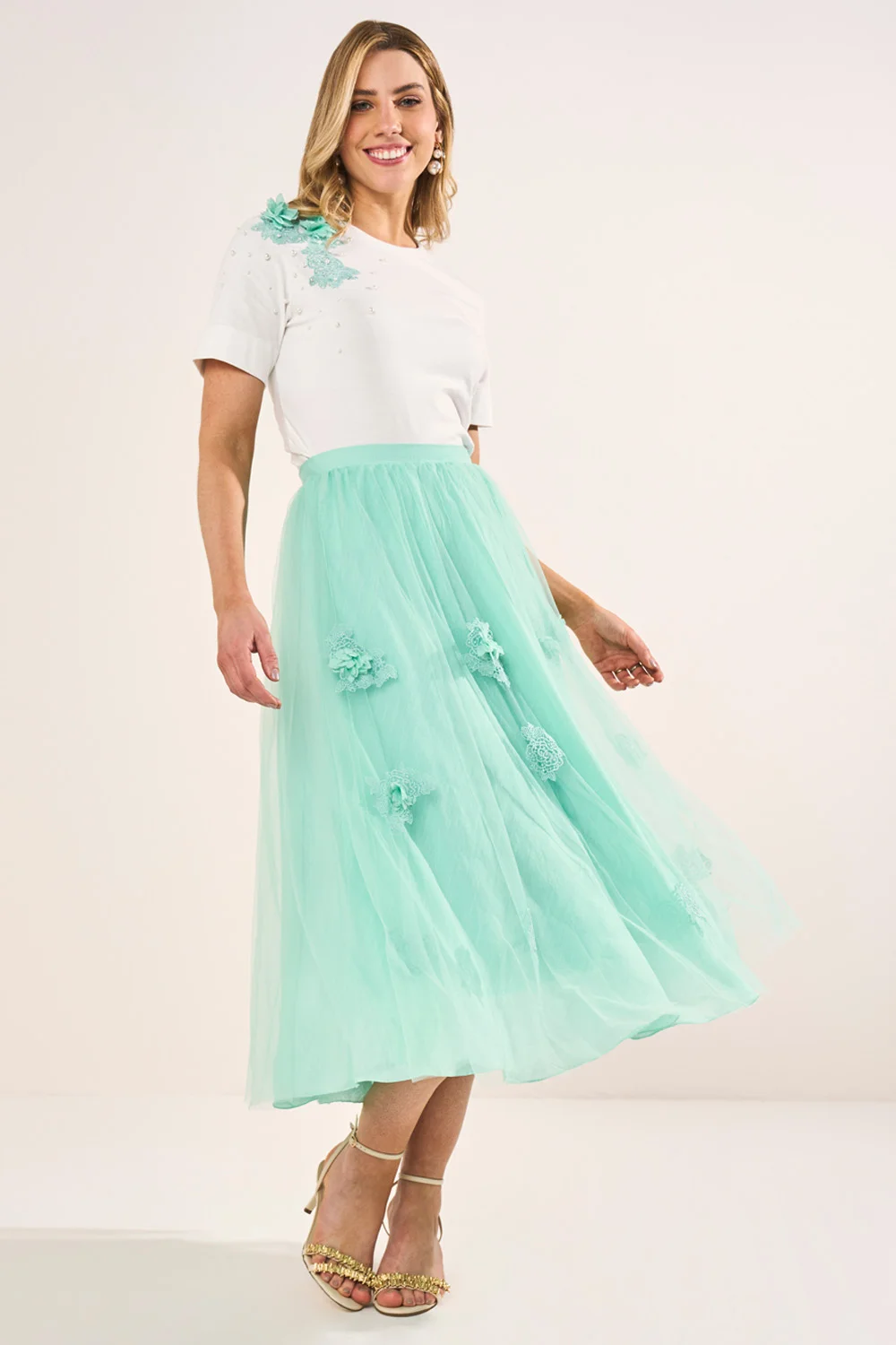 -30%FRETEGRÁTISENVIOIMEDIATOConjunto Verde Claro Com Bordados Florais Industriais Evasê Midi Fasciniusde R$ 719,90 porR$ 468,65 no PIX