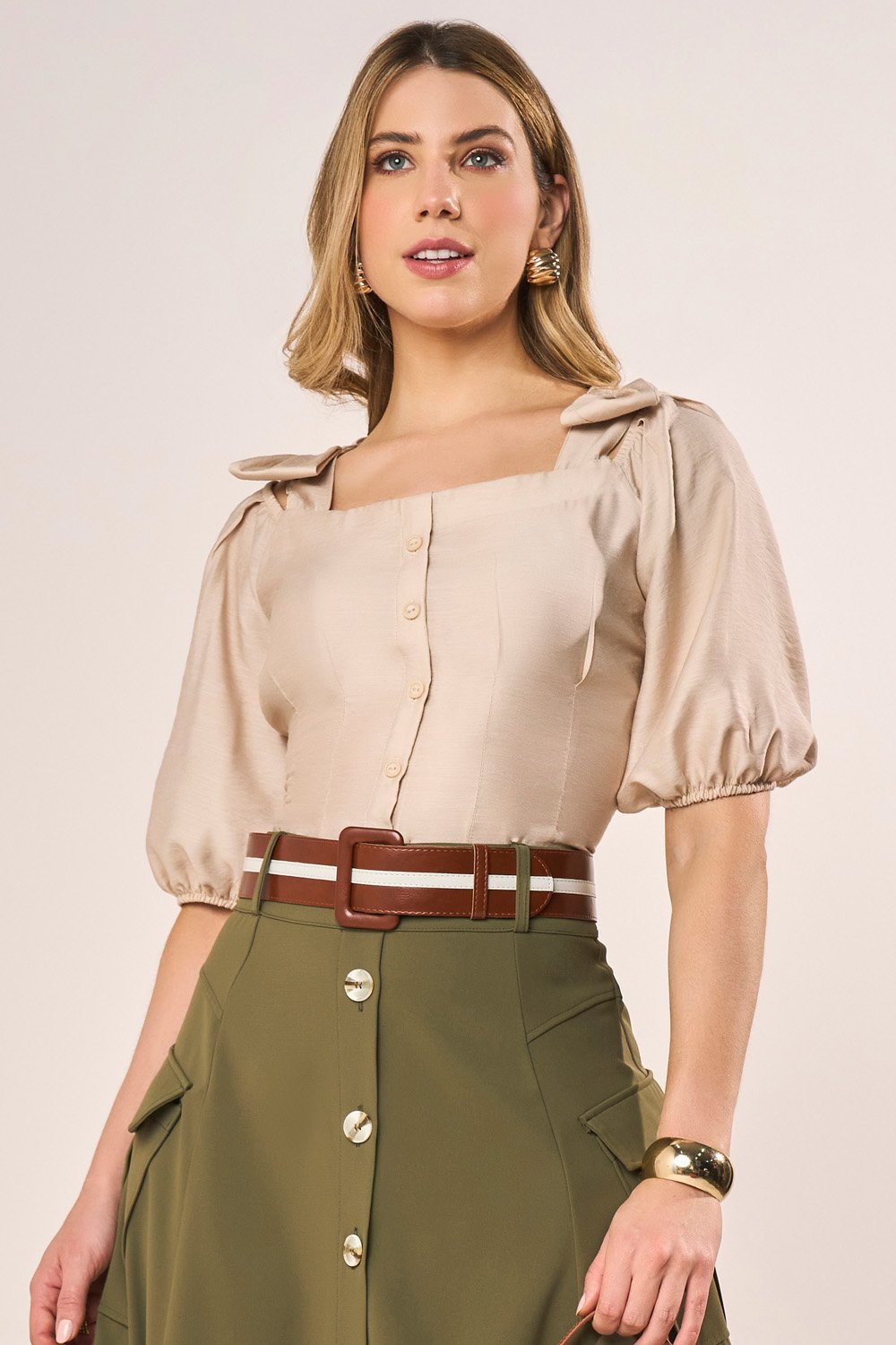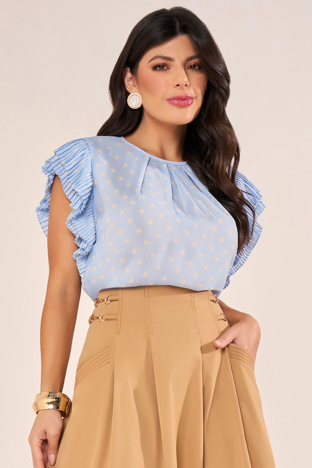 Mas isso não é tudo, a modelagem da blusa traz elementos claros da feminilidade, com um corte acinturado que destaca suas curvas de maneira graciosa, enquanto o caimento soltinho proporciona um visual elegante e confortável.