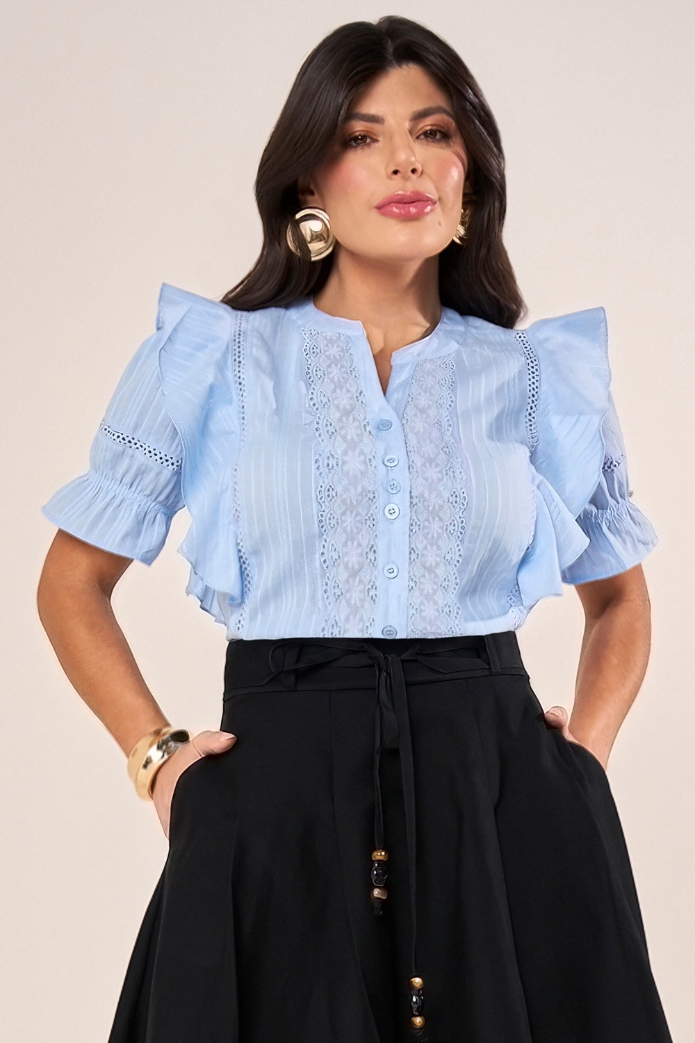 A camisa conta com bordados que combinam com o caimento da peça e são super lindos e ficam perfeitos com a manga bufante.