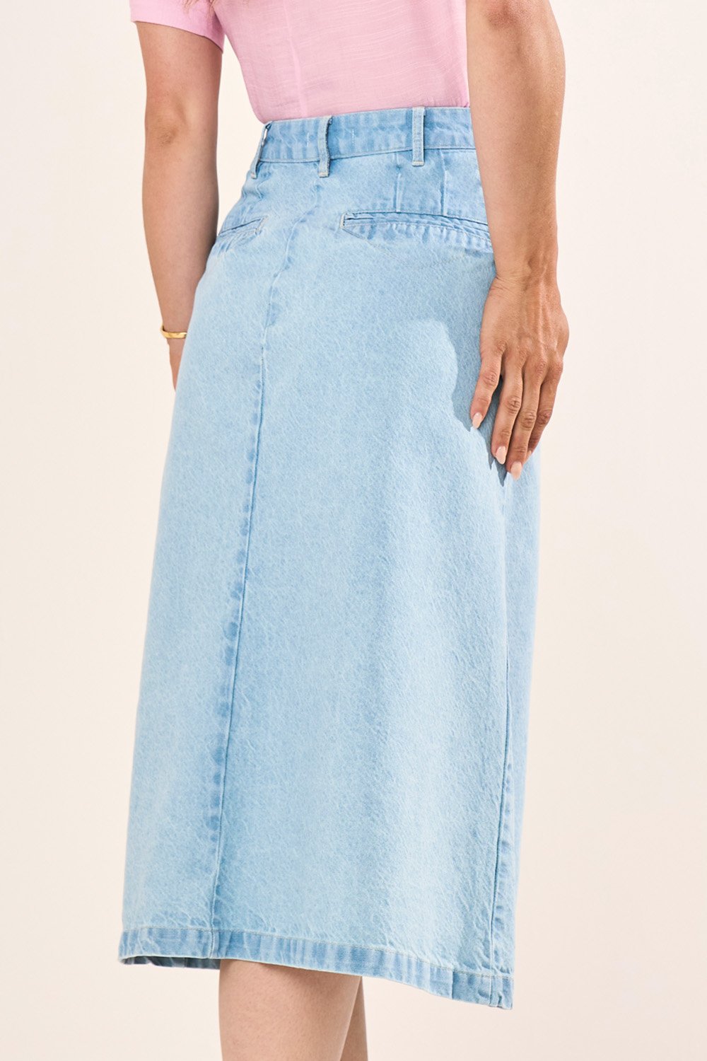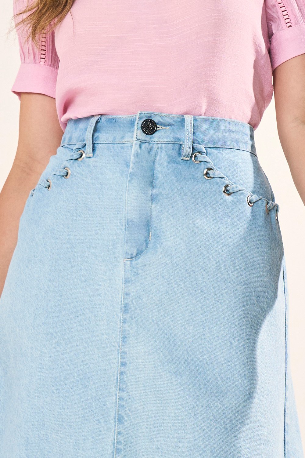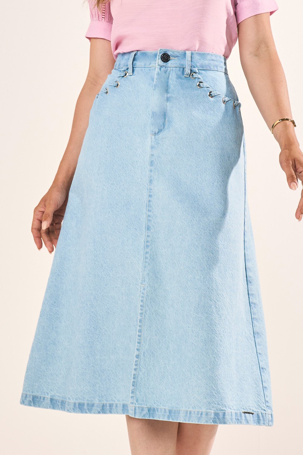 Saia jeans moderna com modelagem midi evasê que une estilo e praticidade. Sua lavagem sky blue garante um visual fresco e atemporal, ideal para composições casuais e sofisticadas. A fenda frontal traz leveza e movimento, tornando a peça mais feminina e marcante. Os bolsos funcionais com detalhes em ilhós e passantes acrescentam personalidade ao design.