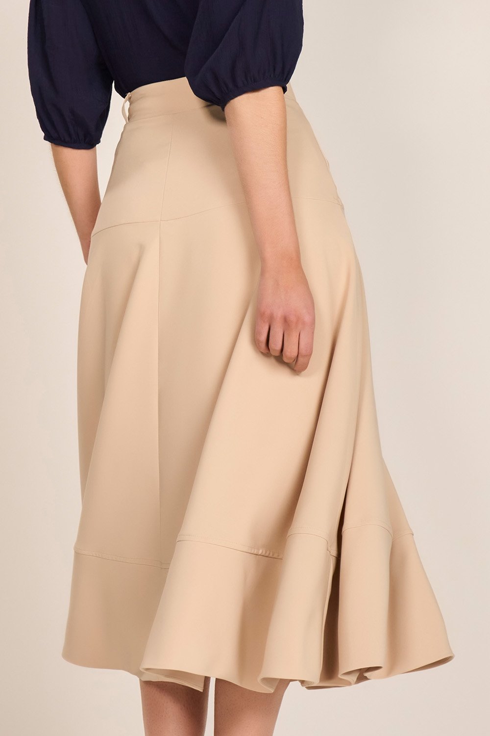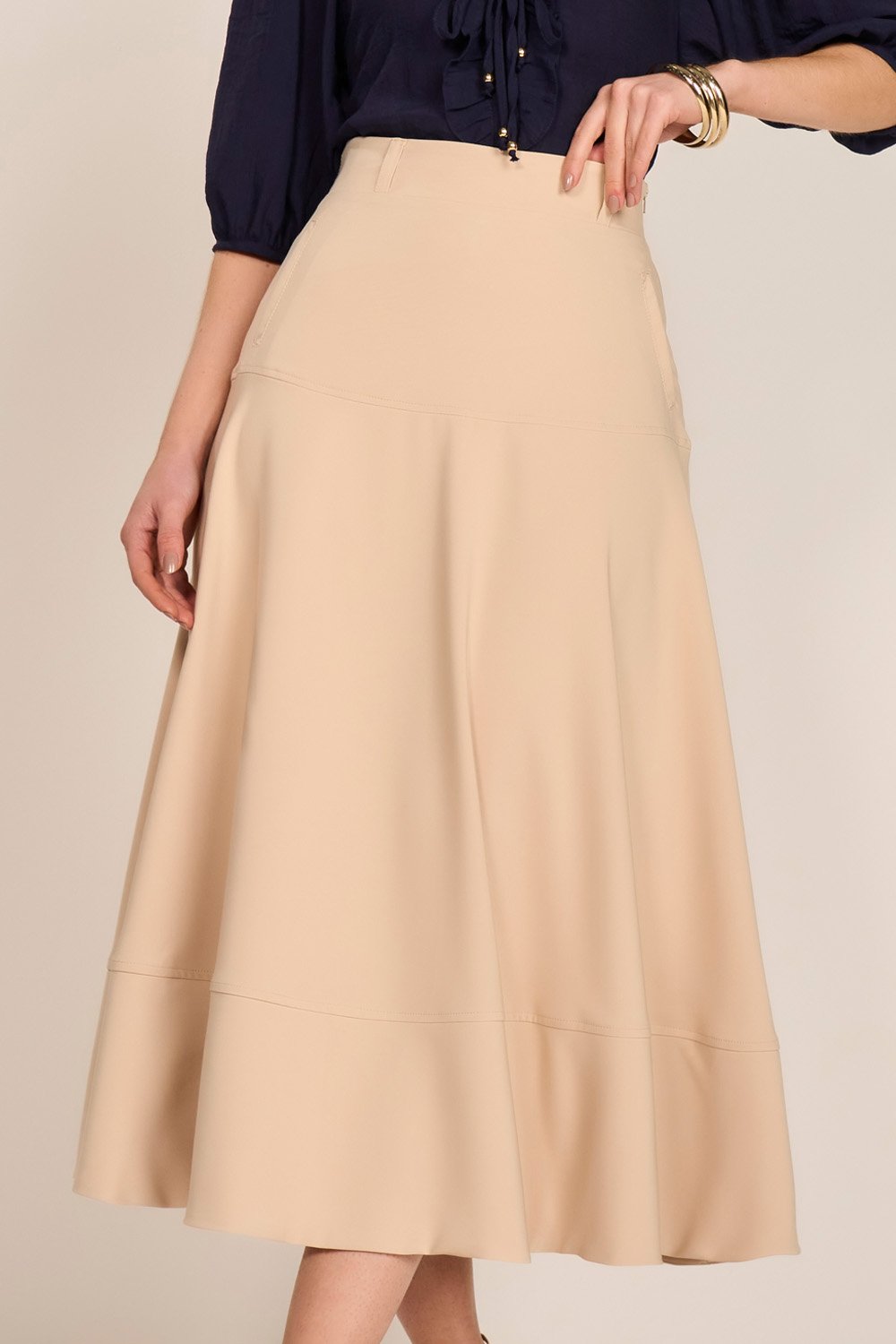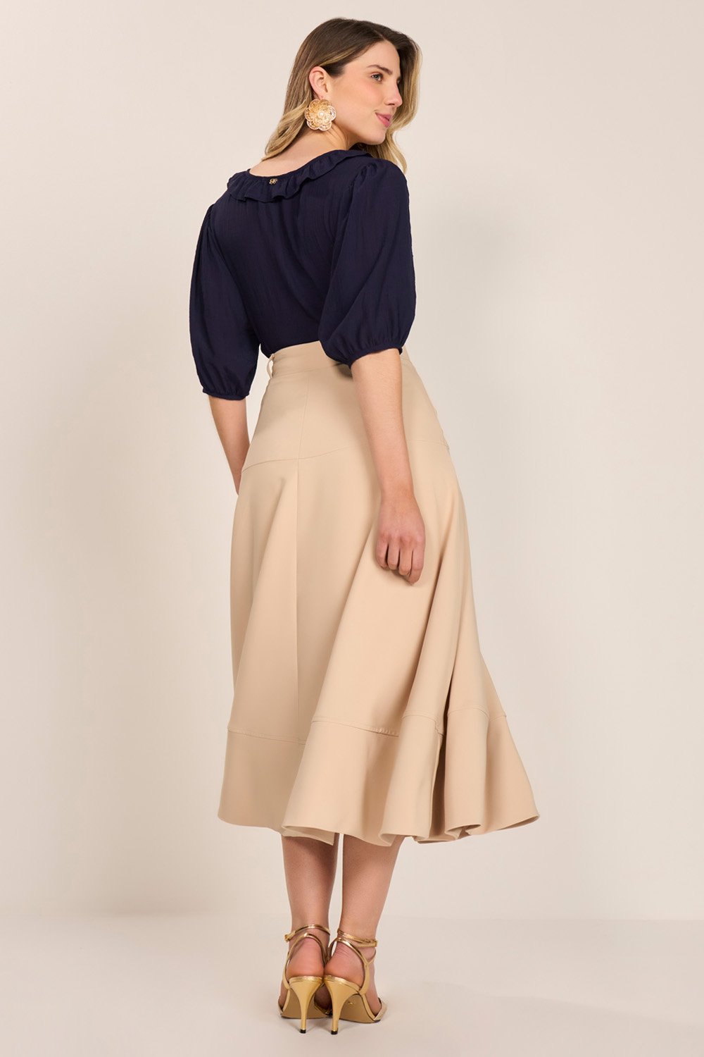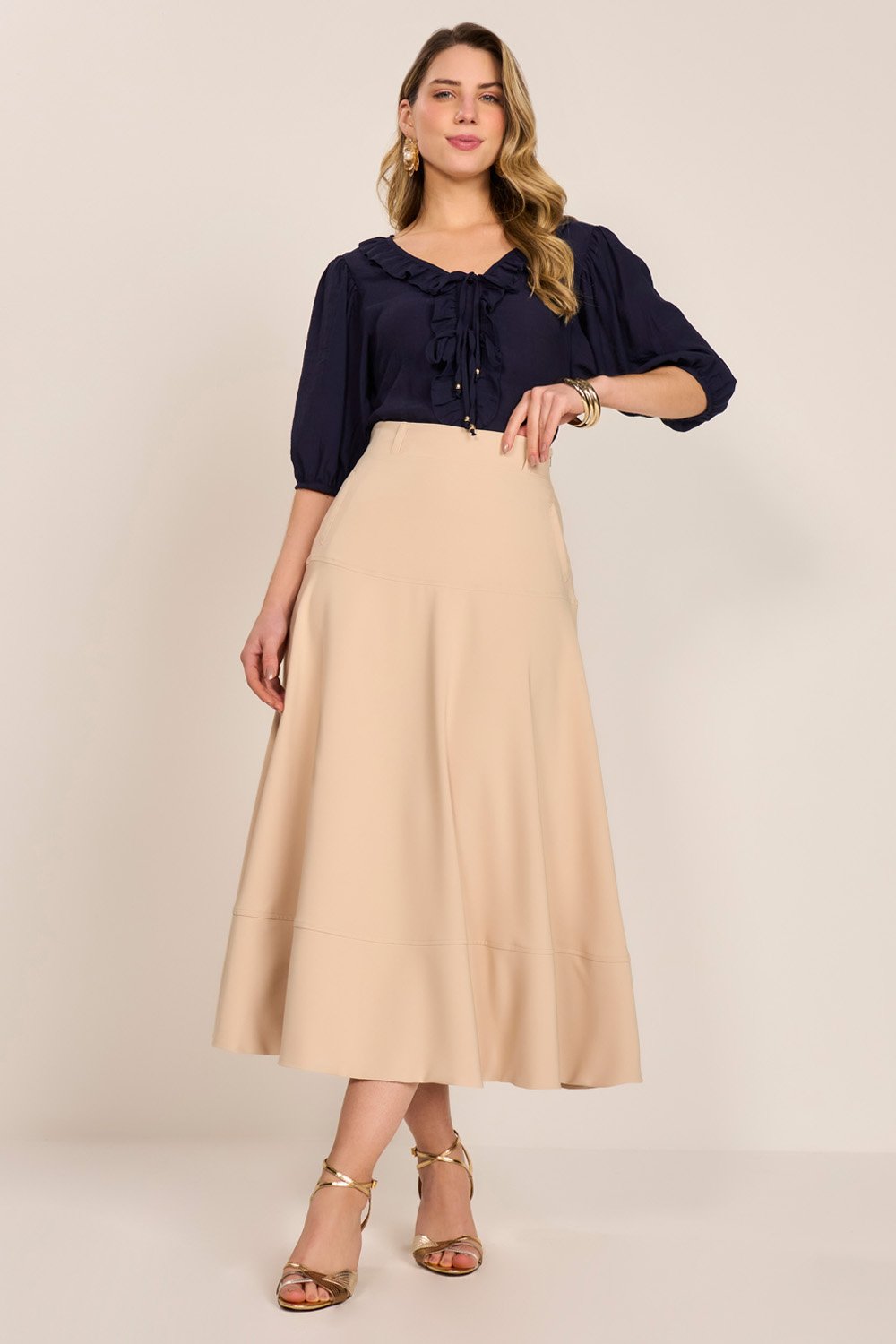 Com um visual alinhado e moderno, essa saia em alfaiataria apresenta pala com detalhe de bolso falso, que adiciona sofisticação ao design. A modelagem godê proporciona movimento leve e feminino, enquanto a barra com vira larga confere acabamento impecável à peça.