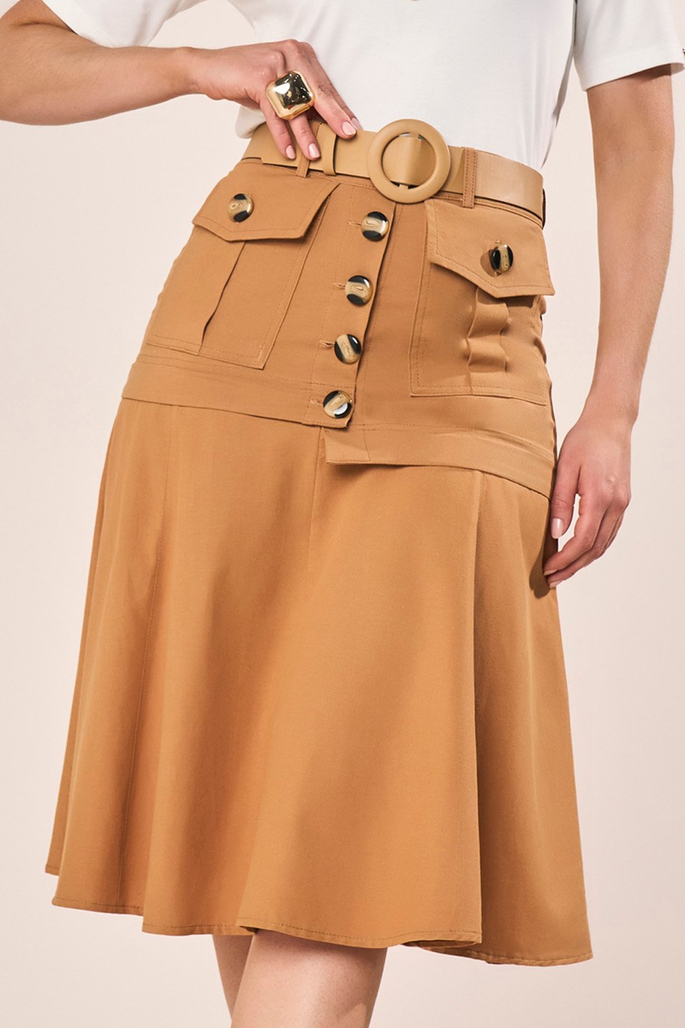Com visual moderno e toque urbano, esta saia reta une estilo e praticidade. O fechamento frontal por botões garante charme contemporâneo, enquanto os bolsos funcionais agregam utilidade ao design. A fenda frontal sutil e os detalhes de tachas laterais reforçam o equilíbrio entre elegância e atitude, tornando a peça perfeita para produções casuais ou de trabalho.