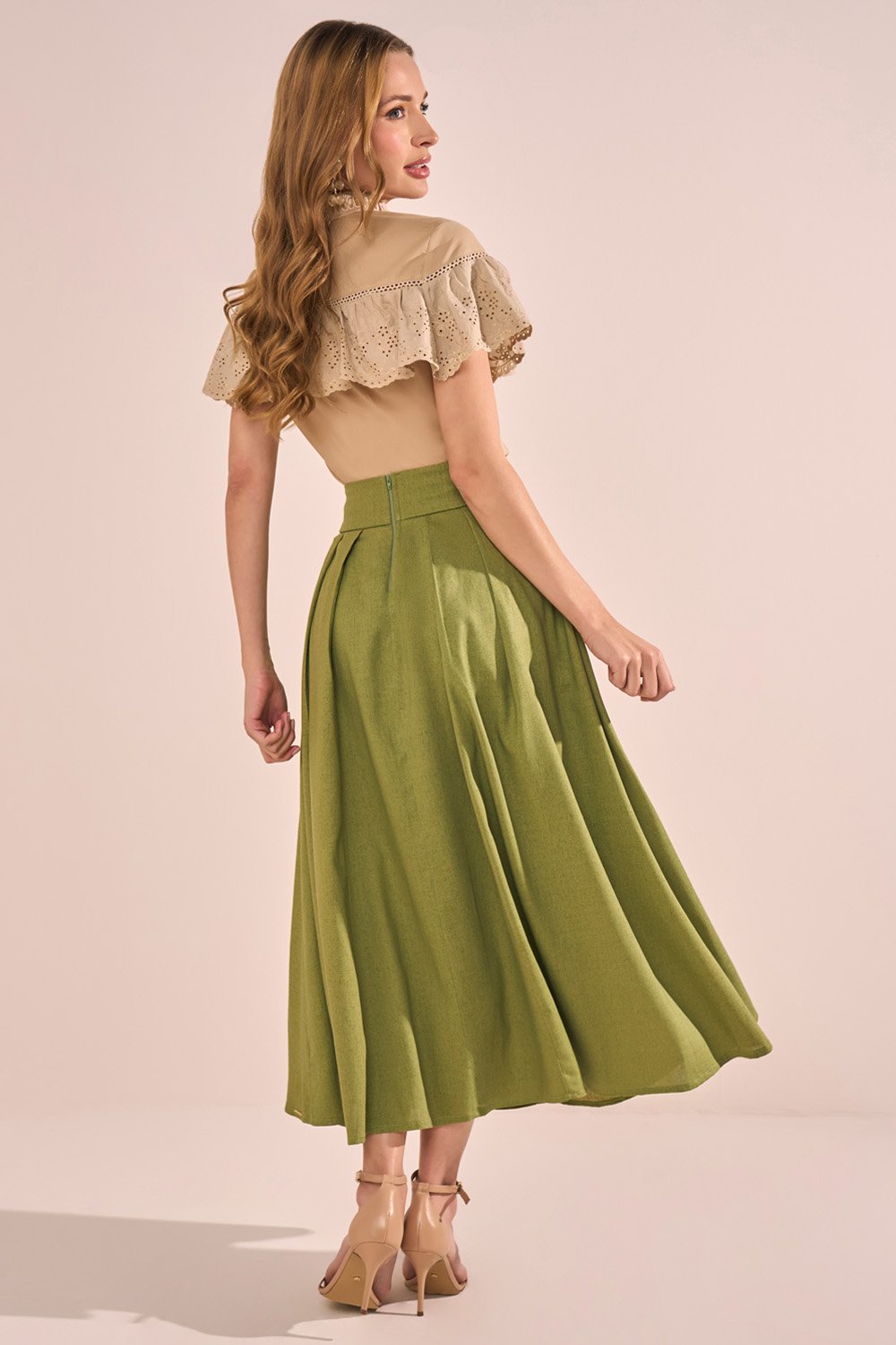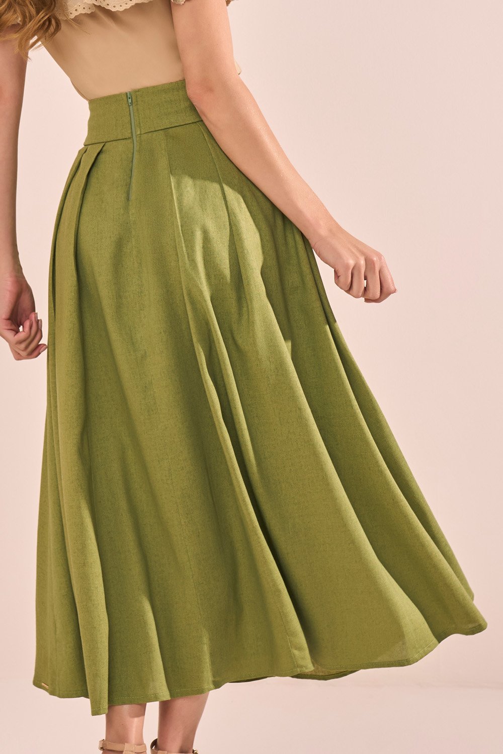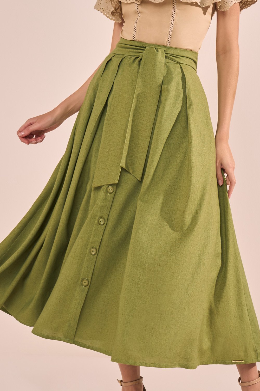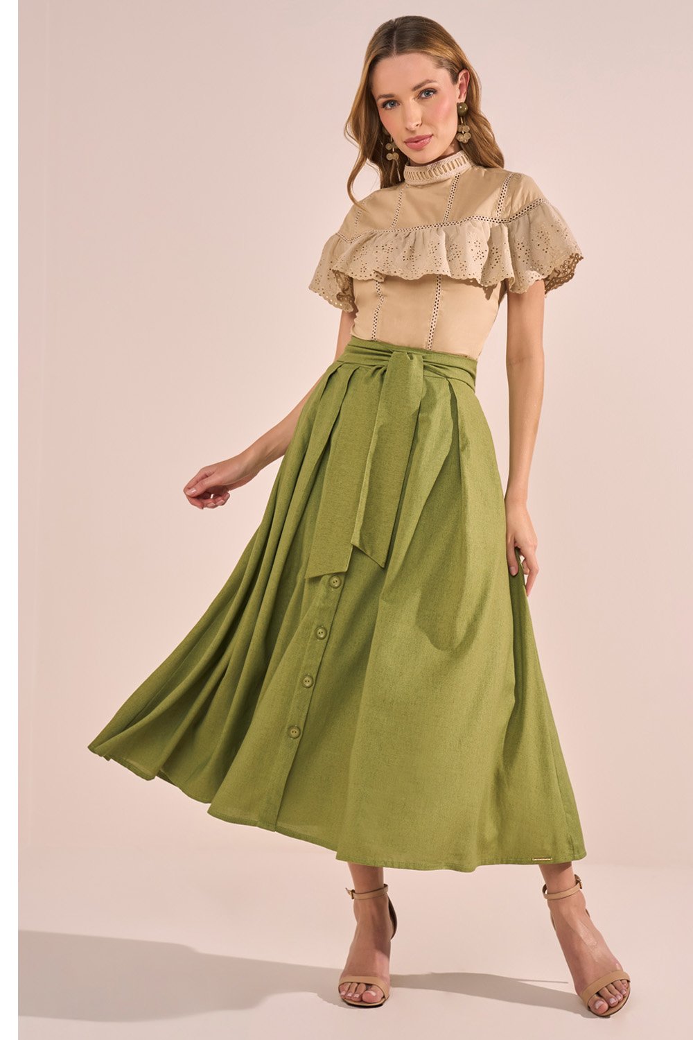 Essa saia midi une sofisticação e conforto em um design atemporal. O modelo godê com pregas garante um caimento elegante e movimento fluido. O cinto faixa costurado ao cós traz praticidade e valoriza a cintura, enquanto os botões frontais funcionam como detalhe decorativo, acrescentando charme ao visual.