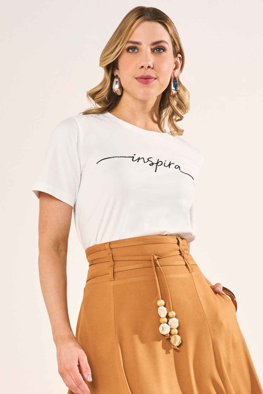 O bordado artesanal em missangas sobre a estampa escrita é o ponto alto desta t-shirt, trazendo brilho discreto e autenticidade ao look. Esse detalhe transforma uma peça básica em algo diferenciado, capaz de transitar entre o casual descontraído e o sofisticado moderno. Ideal para quem gosta de peças atemporais com um toque de exclusividade.