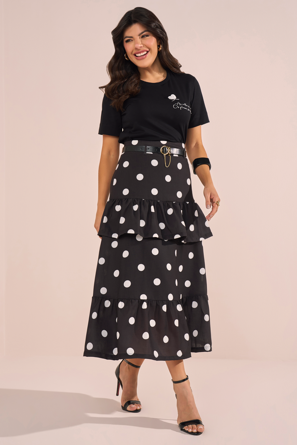 -20%FRETEGRÁTISENVIOIMEDIATOSaia Preta Estampa Poá E Babados Evasê Midi Fasciniusde R$ 439,90 porR$ 327,29 no PIX