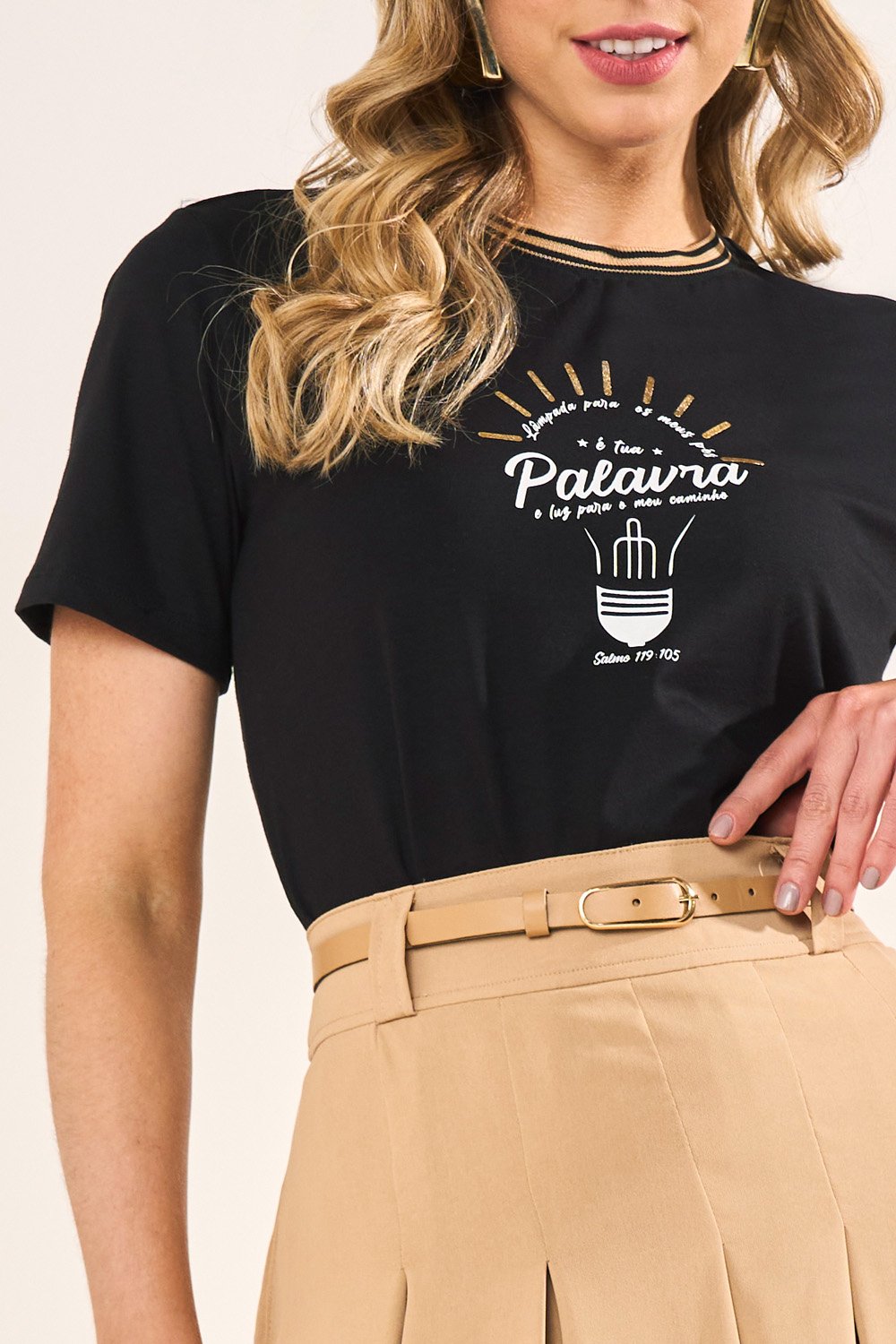 Uma t-shirt moderna que une estilo e fé em uma única peça. Com estampa de escrita em versículo bíblico, ela traz significado e identidade ao look. A gola com ribana é reforçada com fios de lurex, proporcionando brilho discreto e sofisticado. Sua modelagem com mangas curtas garante versatilidade para compor produções casuais e ao mesmo tempo elegantes.