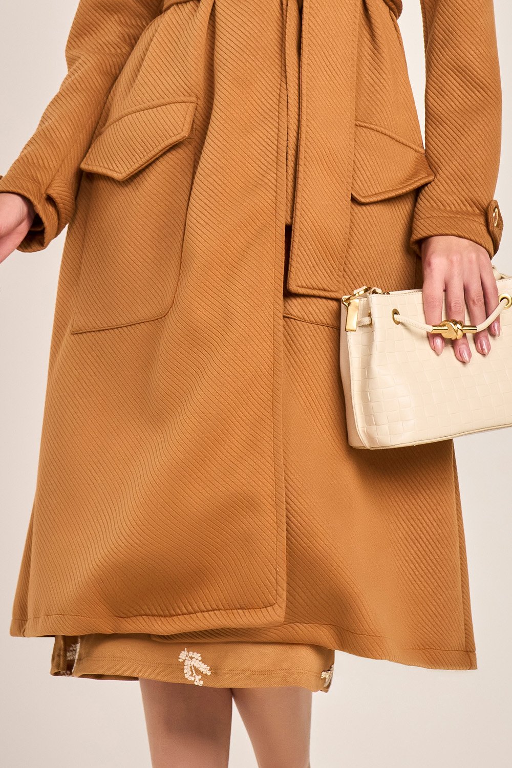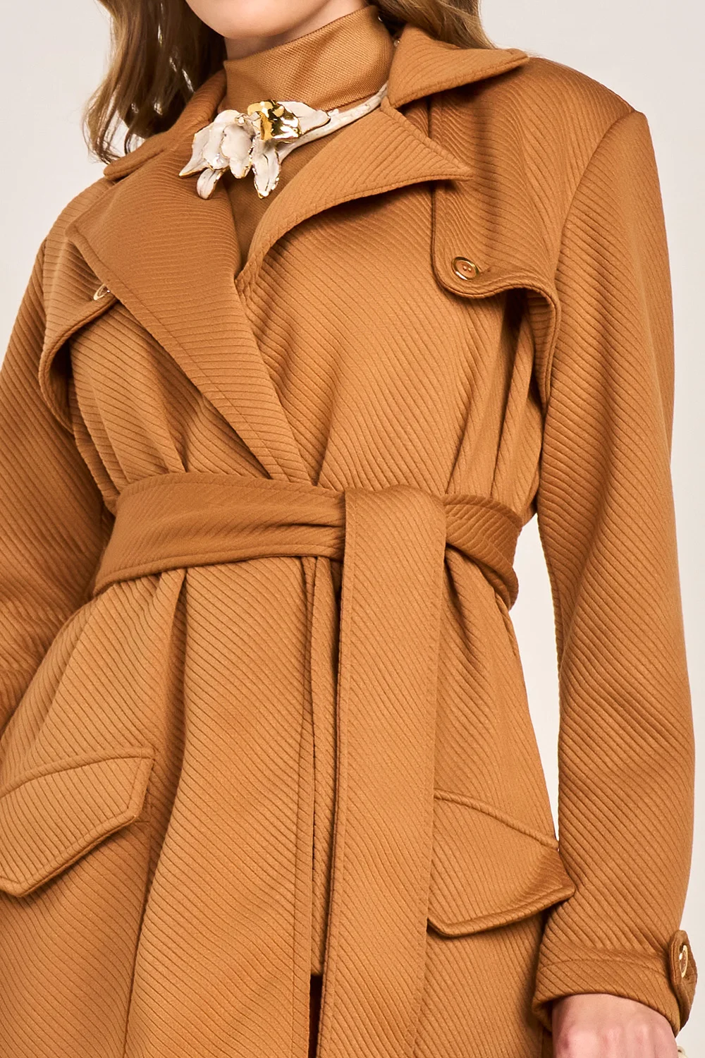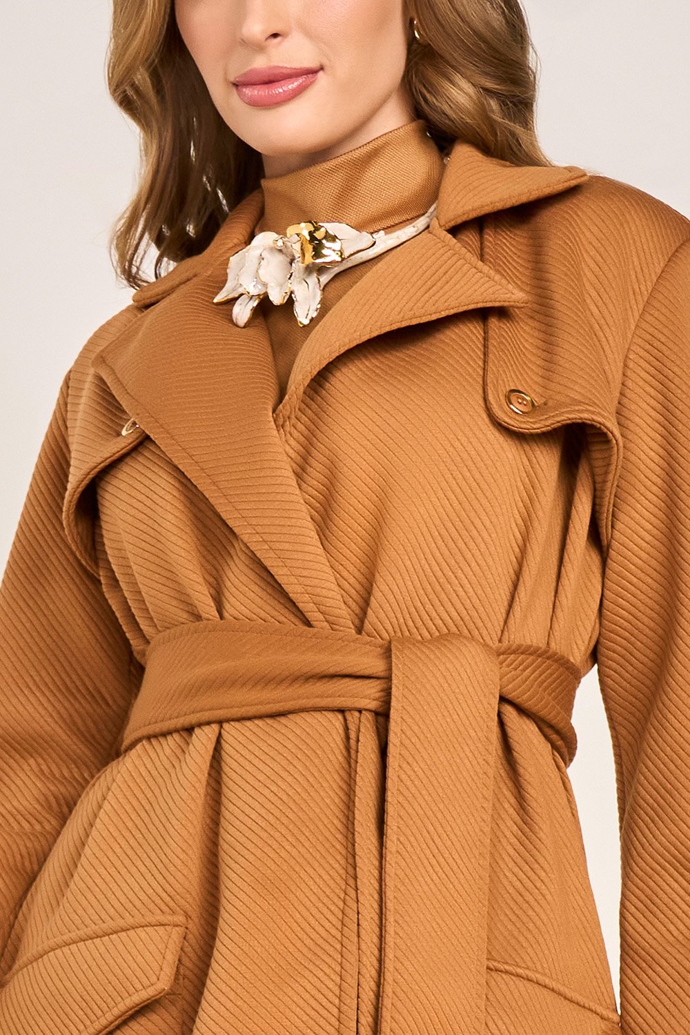 Um trench coat que é pura elegância e estilo. Com modelagem reta e textura em malha matelassê, é perfeito para os dias mais frios, garantindo conforto e sofisticação. Acompanha cinto faixa que realça a cintura, criando uma silhueta elegante.