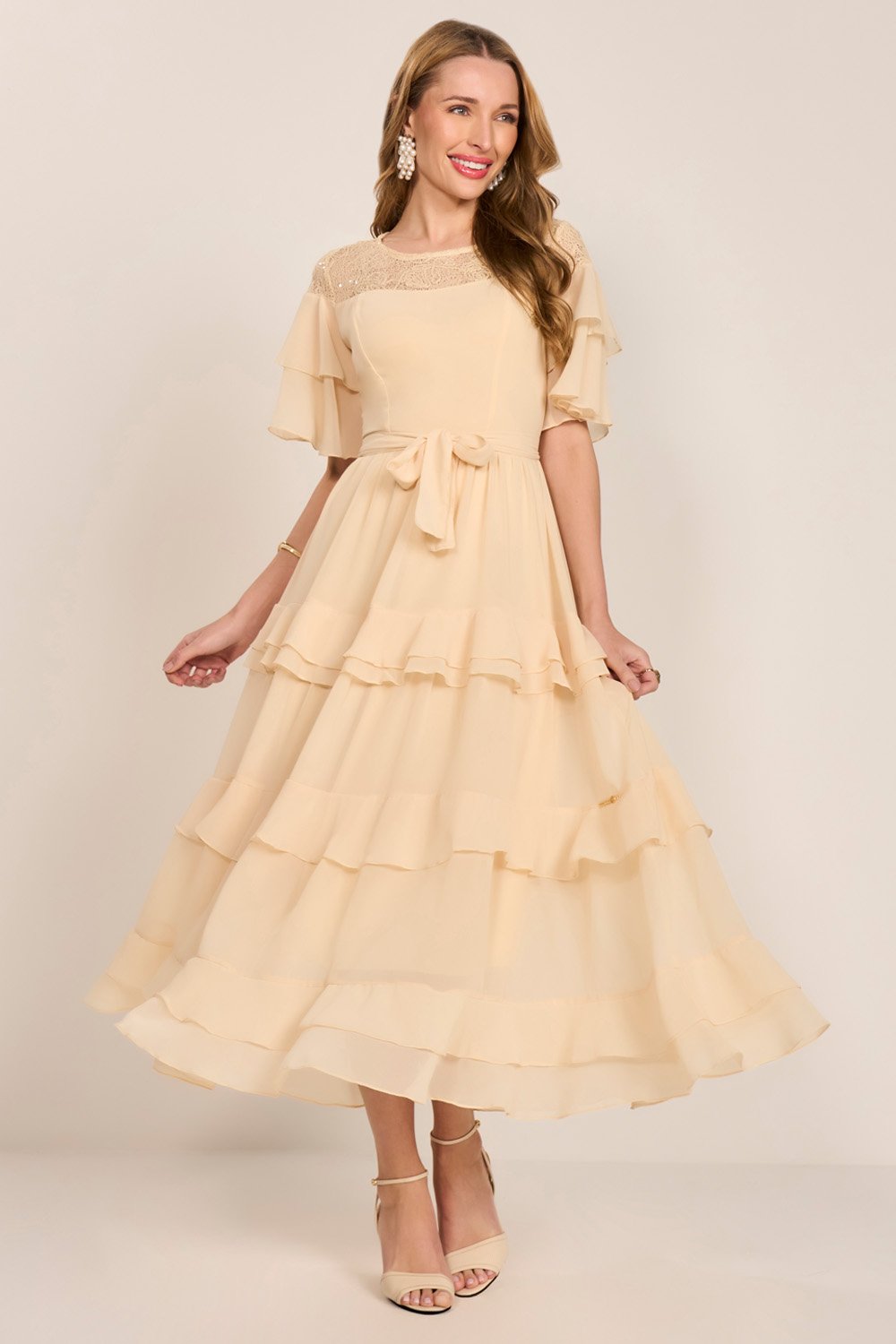 Este vestido midi traz um mix de sofisticação e delicadeza com seus detalhes únicos. Os babados nas mangas e na saia conferem volume na medida certa, enquanto o bordado em paetês e cordonê na pala atrai todos os olhares. Acompanha cinto faixa para marcar a silhueta com elegância.