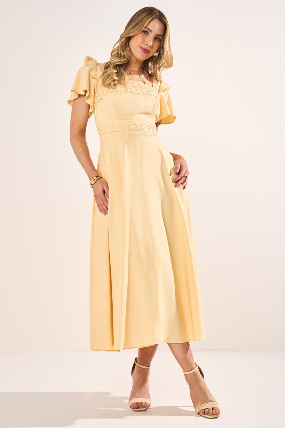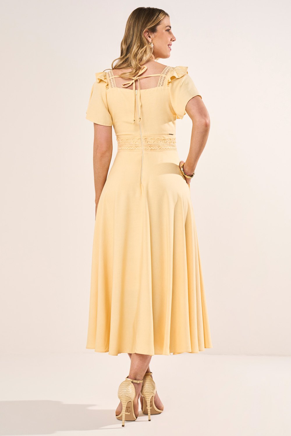 Vestido Amarelo Decote Quadrado Bolsos Funcionais Godê Midi Fascinius