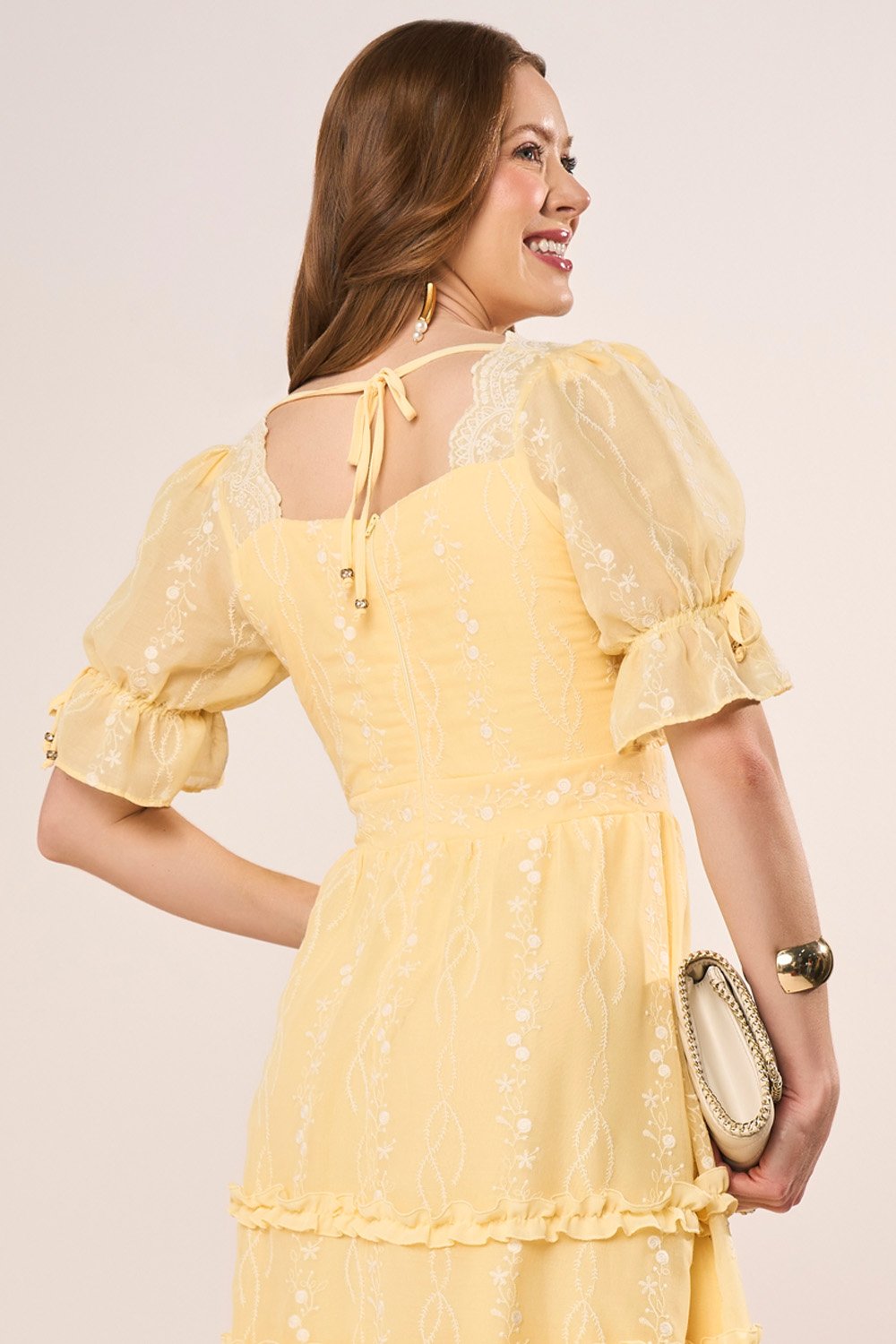 Os mini florais bordados e o decote trabalhado tornam a peça visualmente rica. A manga bufante com laço cria um charme artesanal irresistível. O zíper nas costas, discretamente embutido, facilita o vestir sem interferir no design. Um vestido pensado para mulheres que apreciam delicadeza, elegância e acabamento impecável.