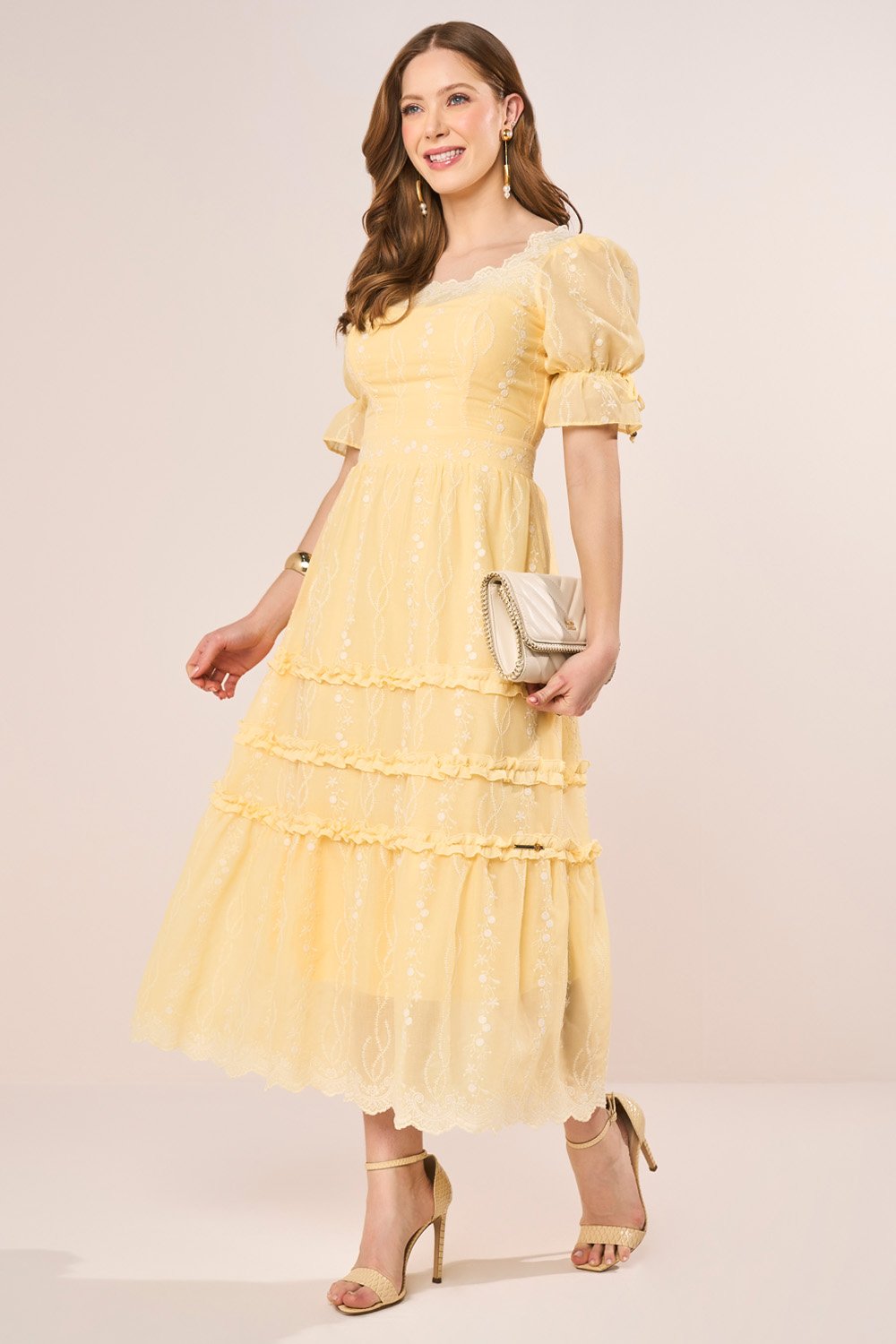 Delicado e extremamente feminino, este vestido em cambraia traz bordados industriais de mini florais que enriquecem o visual com suavidade. O decote recebe aplicação de tecido bordado, criando um ponto de destaque sofisticado. As mangas bufantes com elástico acompanham laço decorativo que adiciona charme extra. A modelagem evasê dá movimento leve e elegante, ideal para compor um look romântico e atemporal.