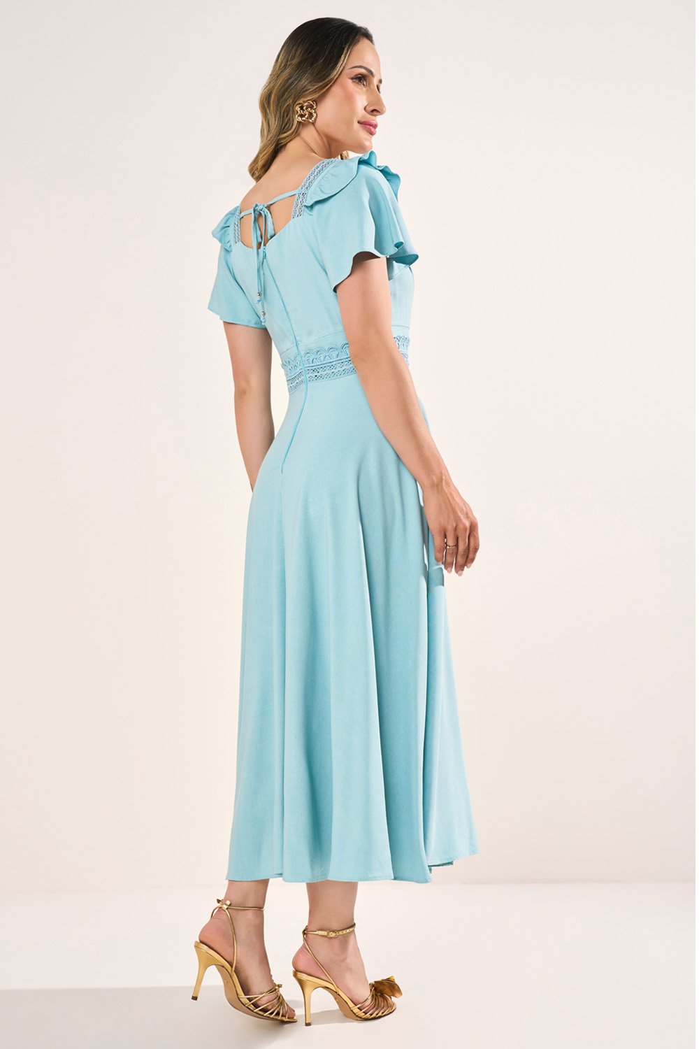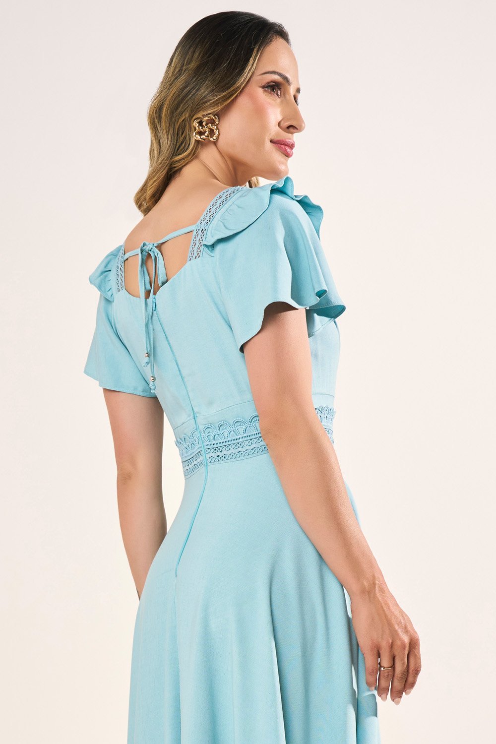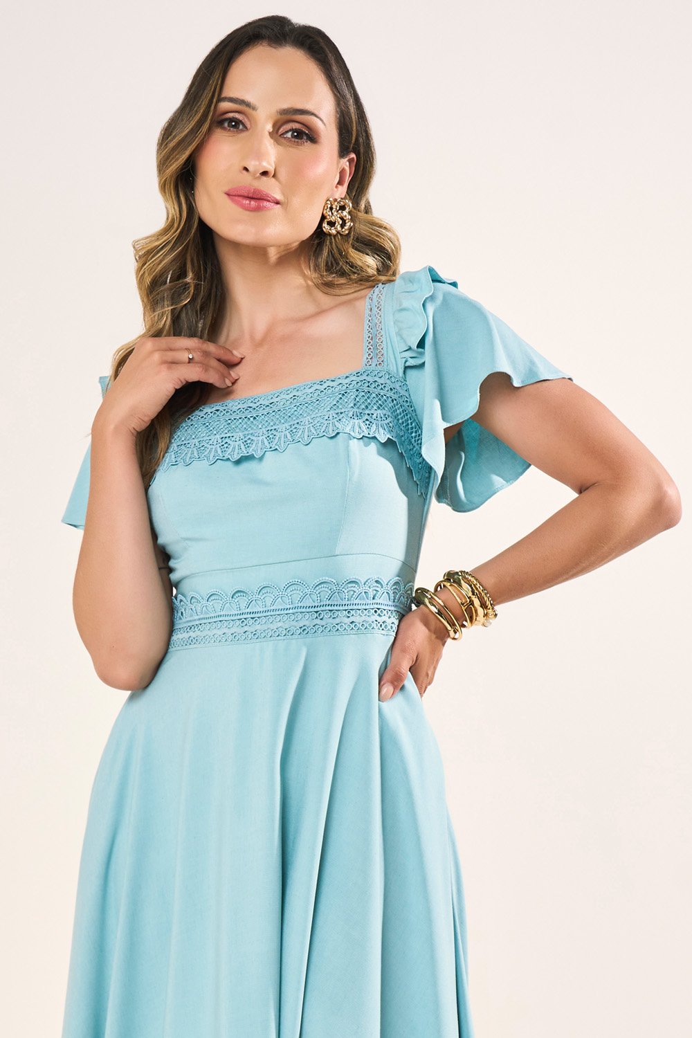 O cós em guipir é um dos pontos mais marcantes, realçando a feminilidade com sofisticação. A saia godê valoriza a silhueta, enquanto os bolsos funcionais oferecem charme e praticidade. Um vestido pensado para unir estilo, conforto e exclusividade.