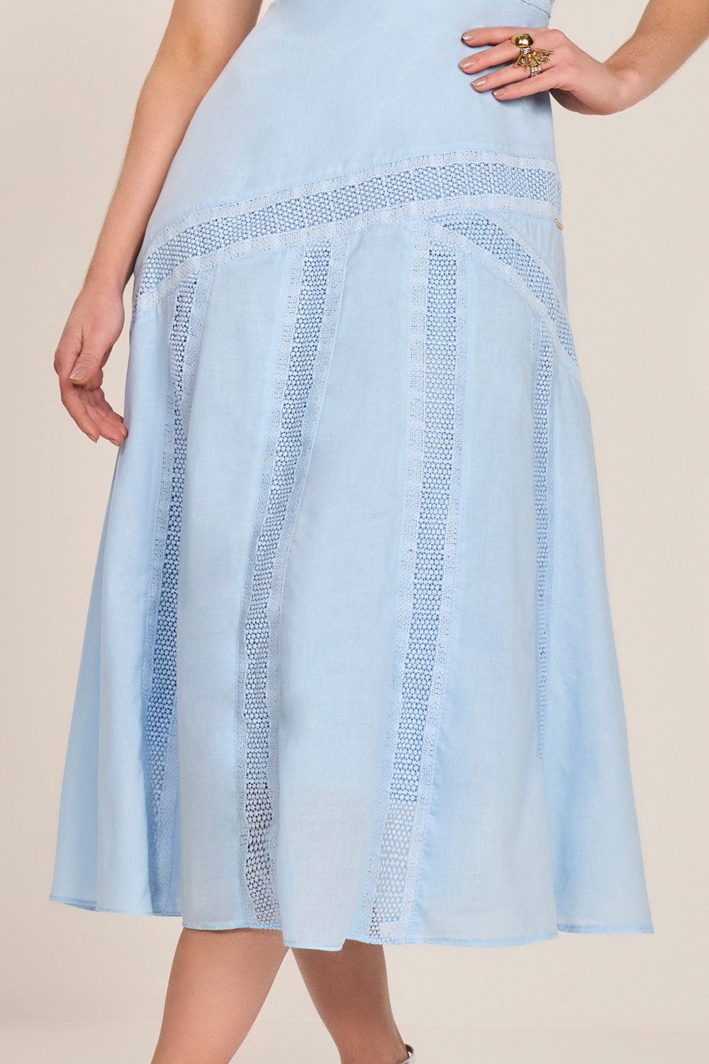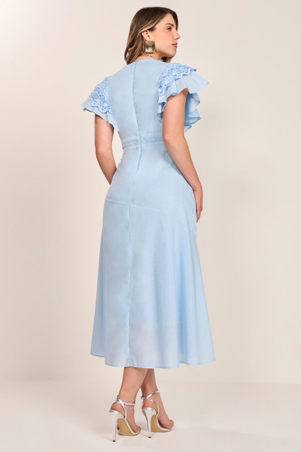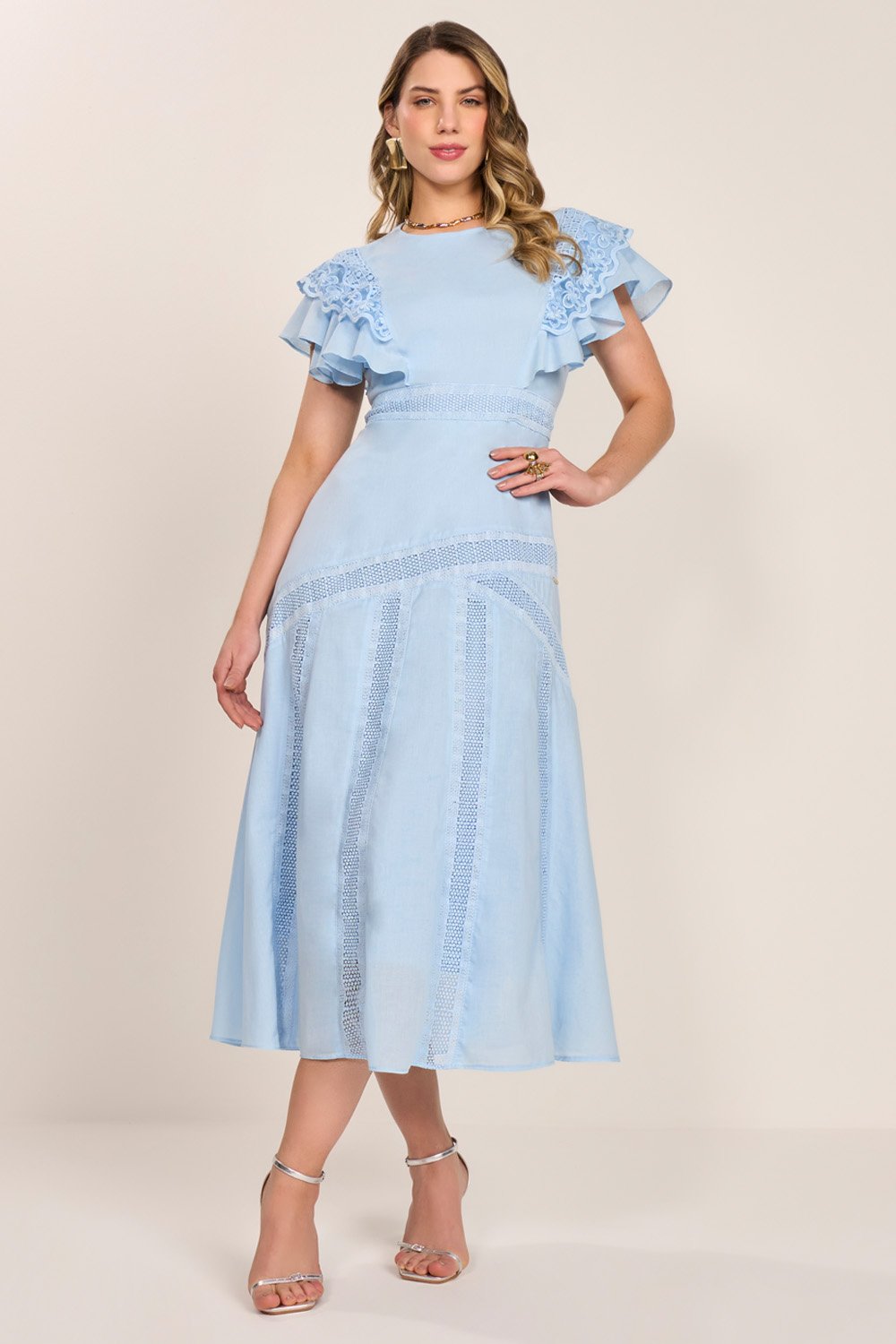 Elegante e delicado, este vestido encanta com seus detalhes artesanais e visual refinado. A aplicação de tule bordado e entremeios de guipir em formas geométricas adiciona sofisticação à peça. As mangas com babado e a modelagem evasê garantem leveza, enquanto o comprimento midi mantém a elegância em destaque.