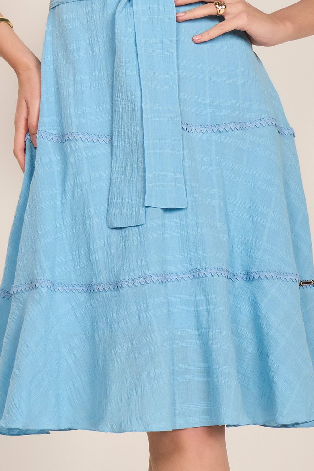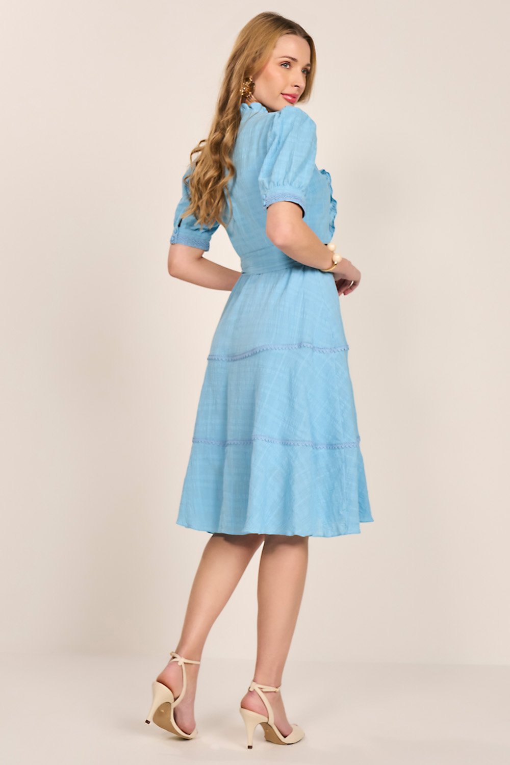 O mix de babados com entremeios oferece um contraste visual encantador. A gola com babadinhos valoriza o colo de forma delicada. O cinto faixa marca a silhueta, e o zíper lateral garante praticidade ao vestir.