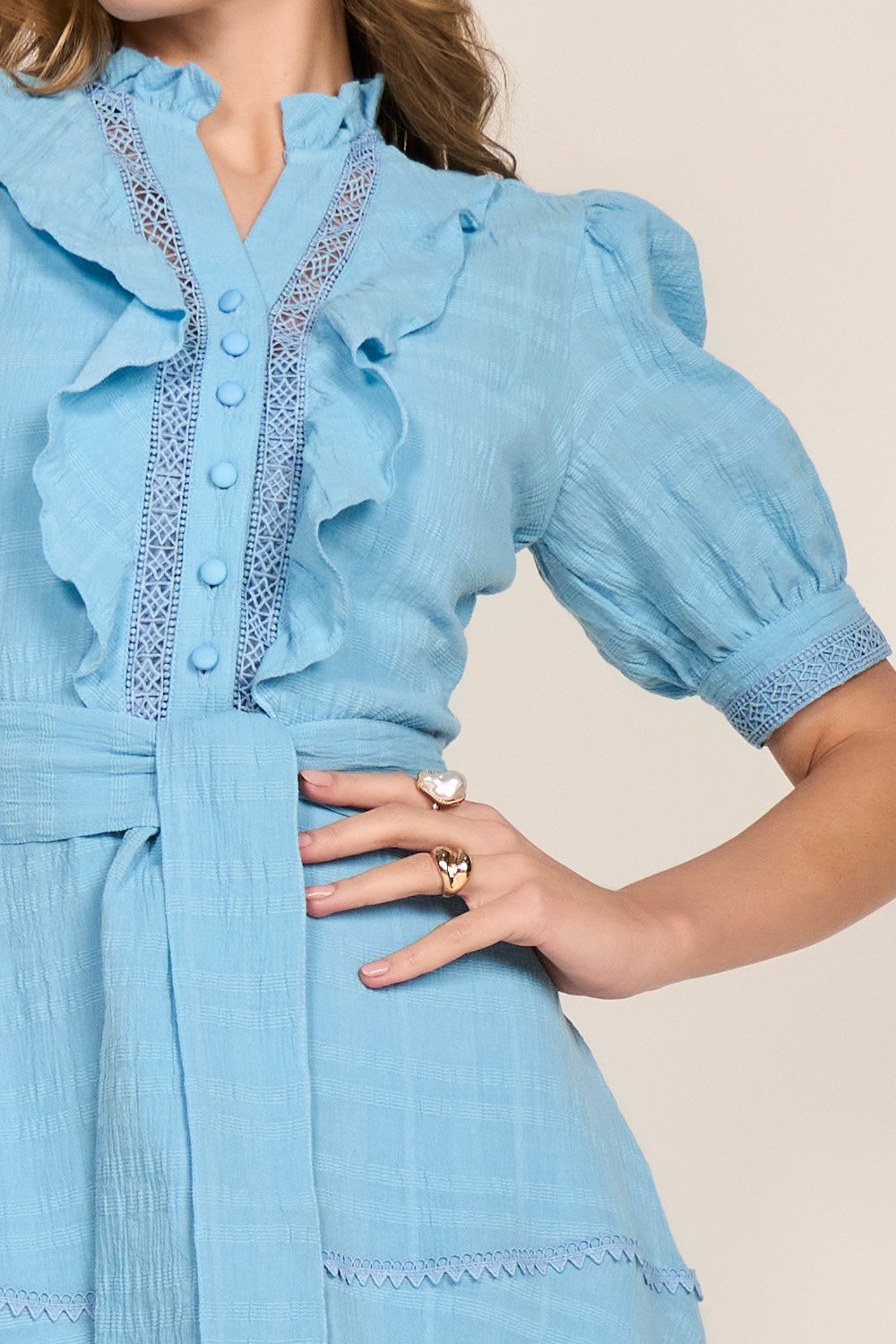 Este vestido curto une feminilidade e elegância em uma composição encantadora. A gola com babadinhos e entremeios de guipir enriquecem visualmente a peça, adicionando textura e delicadeza. O abotoamento frontal e o cinto faixa permitem ajuste personalizado à cintura.
