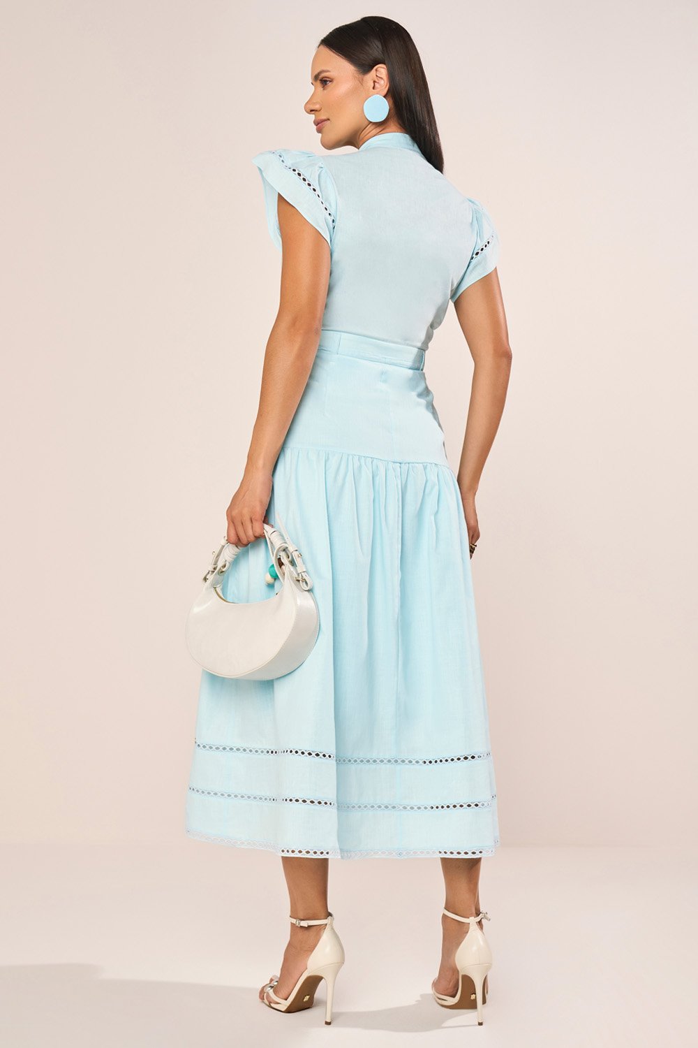 O algodão utilizado na construção deste modelo oferece frescor e respirabilidade, proporcionando toque macio e conforto absoluto ao longo do dia. Seu caimento leve favorece o desenho evasê, permitindo movimento contínuo sem perder a estrutura elegante da modelagem. A textura natural do tecido realça os entremeios de guipir, dando a cada detalhe um destaque sutil. O forro interno mantém a peça impecável ao vestir, garantindo discreção e maior estabilidade à silhueta