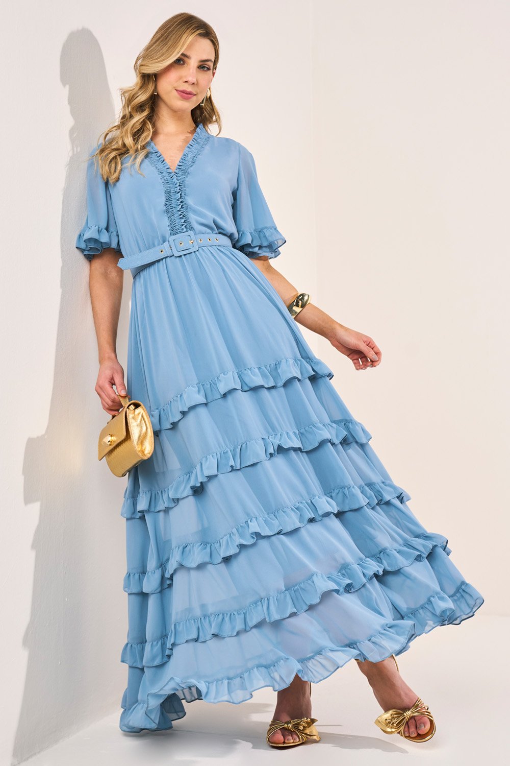 Os babados em camadas na saia são o grande destaque, adicionando charme e movimento a cada passo. O cinto encapado com fivela retangular é um acessório que eleva a produção, criando um look completo e sofisticado. Uma peça perfeita para ocasiões especiais, combinando conforto e elegância em harmonia.