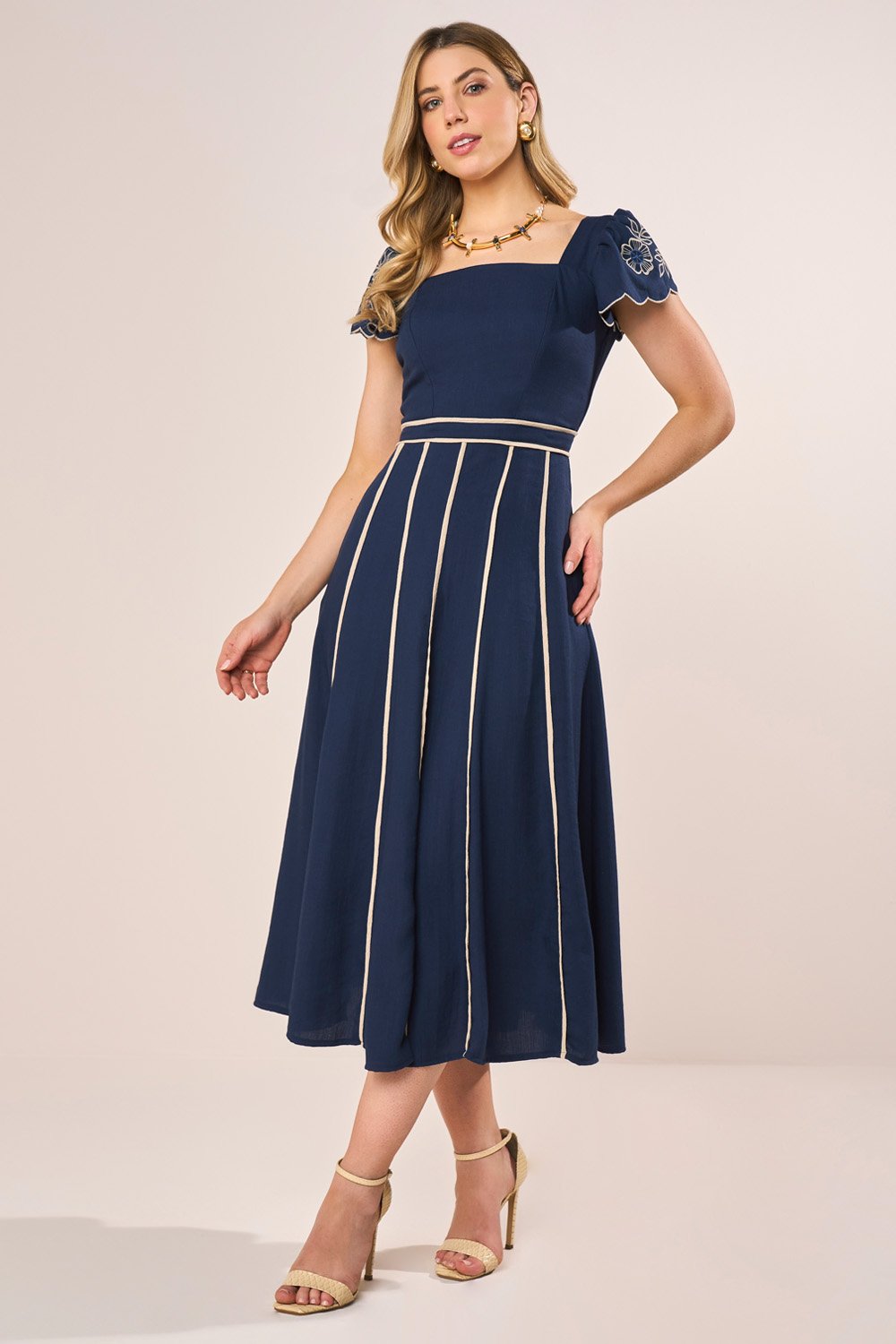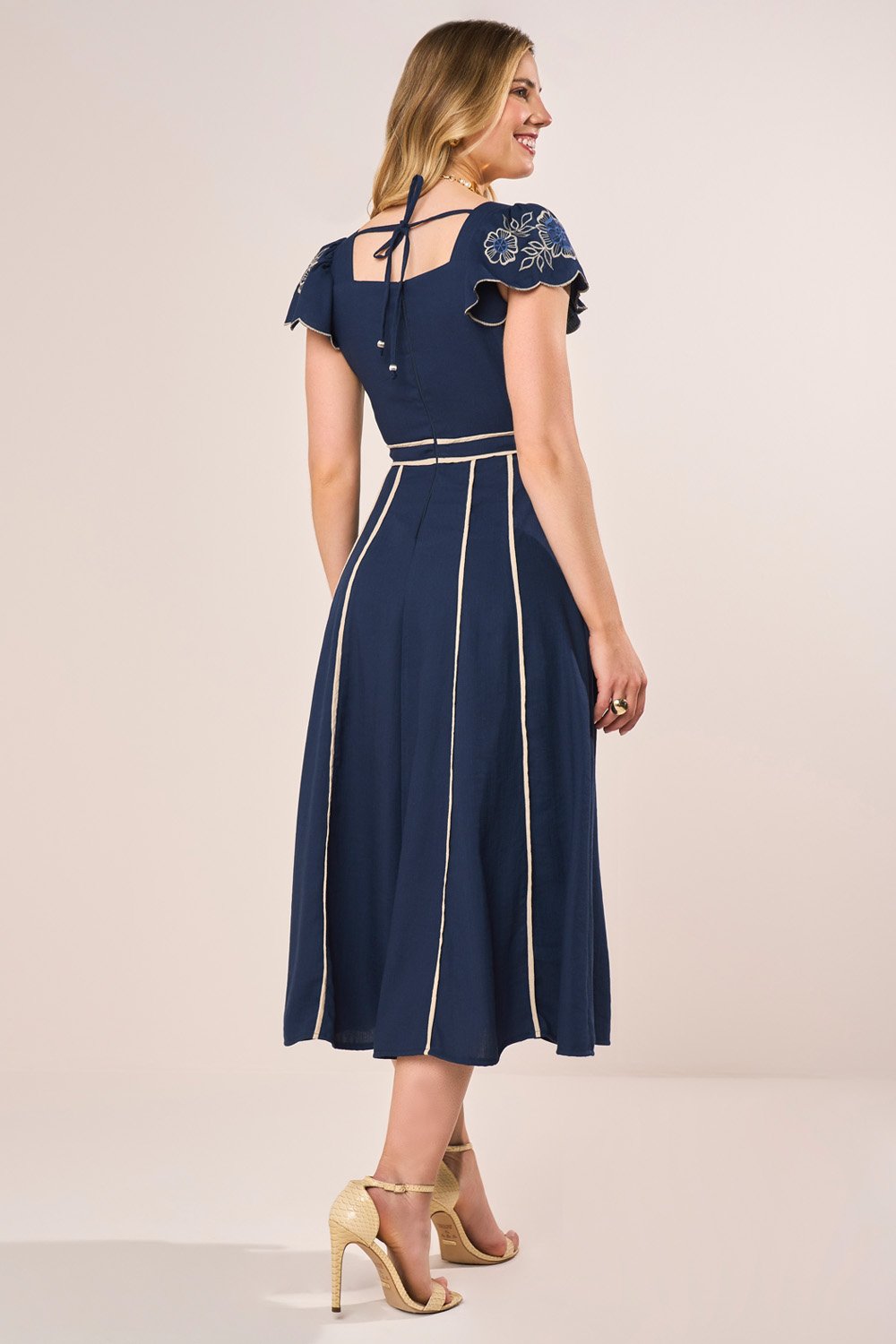 Este vestido combina elegância e modernidade em uma modelagem encantadora. As mangas com bordados delicados e o cós que imita um cinto criam um efeito refinado que valoriza a silhueta. A saia godê confere movimento e leveza ao visual, tornando-o ideal para ocasiões especiais e produções que pedem um toque de sofisticação.