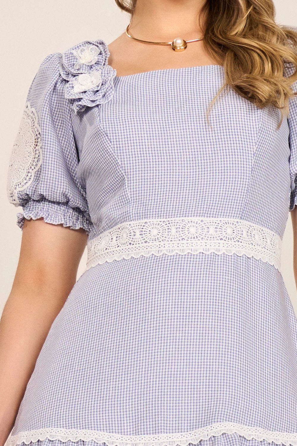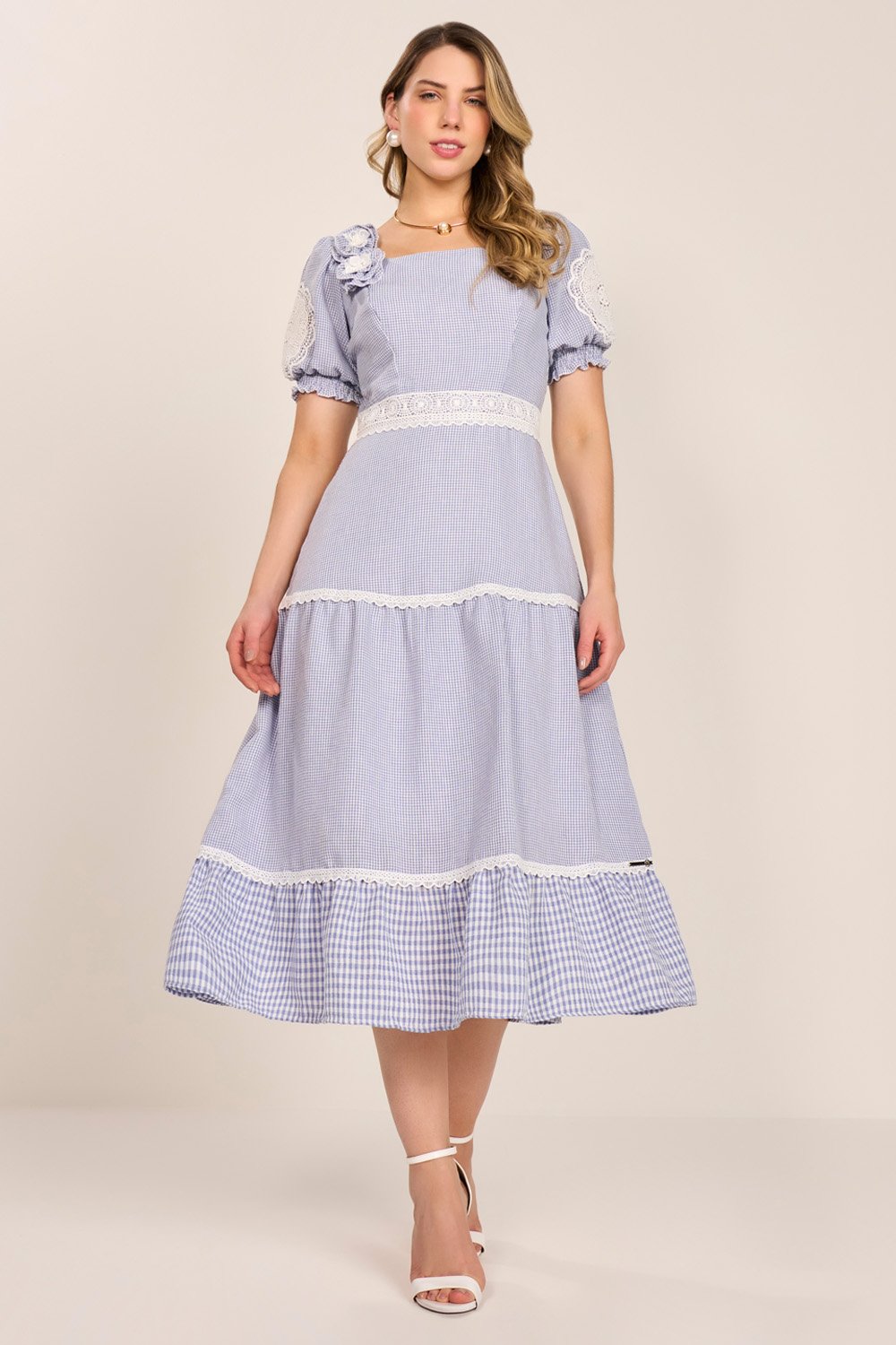 Com um visual romântico e elegante, o vestido apresenta um encantador mix de estampa vicky, enriquecido por detalhes em guipir nas mangas que valorizam a delicadeza da peça. Acompanha broche em flor com acabamento refinado, adicionando sofisticação ao visual. Sua modelagem evasê e comprimento midi garantem leveza e movimento, perfeito para compor produções clássicas com um toque fashion.