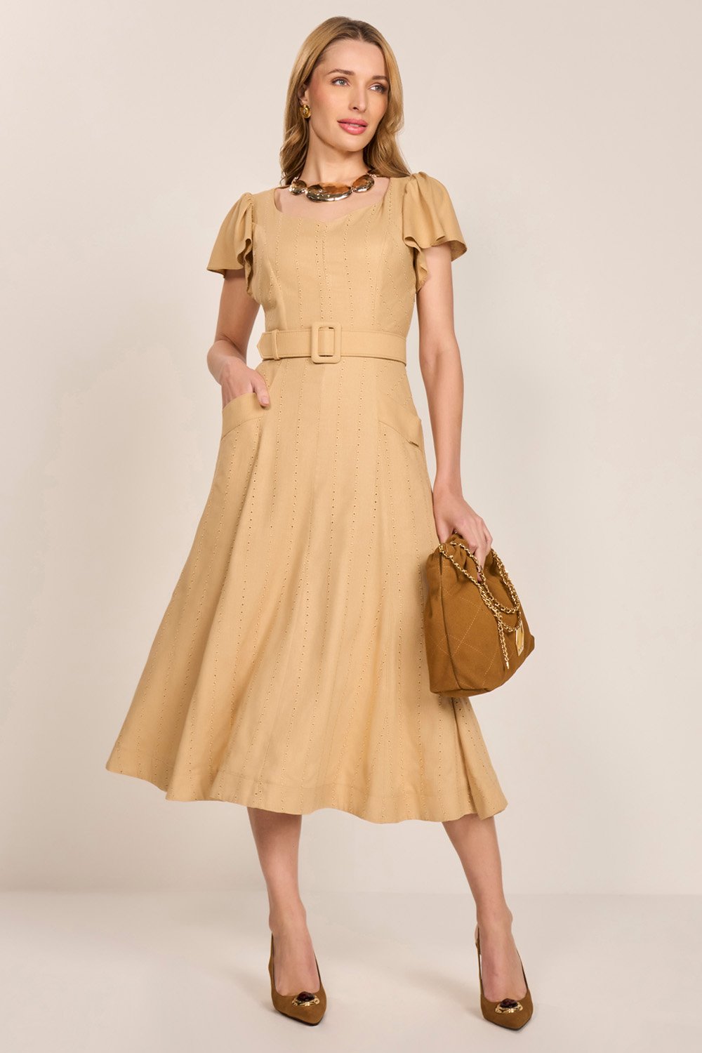 Com estilo romântico e acabamento minucioso, este vestido em laise encanta pelos detalhes. O decote V valoriza o colo, as mangas evasê trazem fluidez e os recortes acompanham as curvas do corpo com sutileza. O cinto encapado com fivela marca a cintura, enquanto os bolsos funcionais completam a proposta com praticidade e charme.