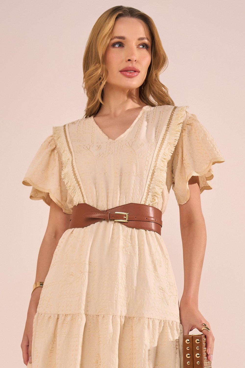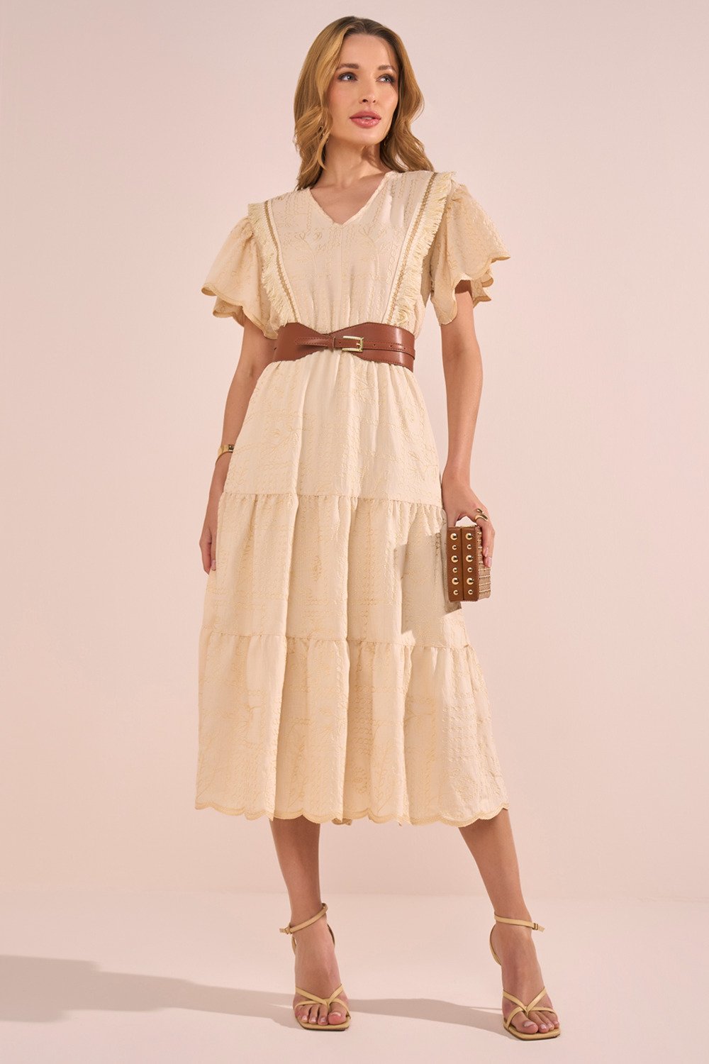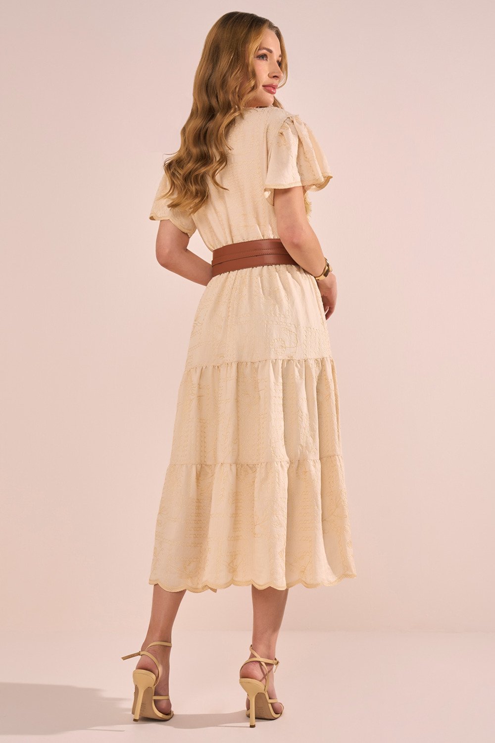 Os bordados em relevo elevam o visual com um toque artesanal elegante. As mangas evasê trazem fluidez e romantismo, enquanto o acabamento da barra demonstra o cuidado nos detalhes da confecção. Uma peça ideal para ocasiões que pedem delicadeza, frescor e presença marcante.