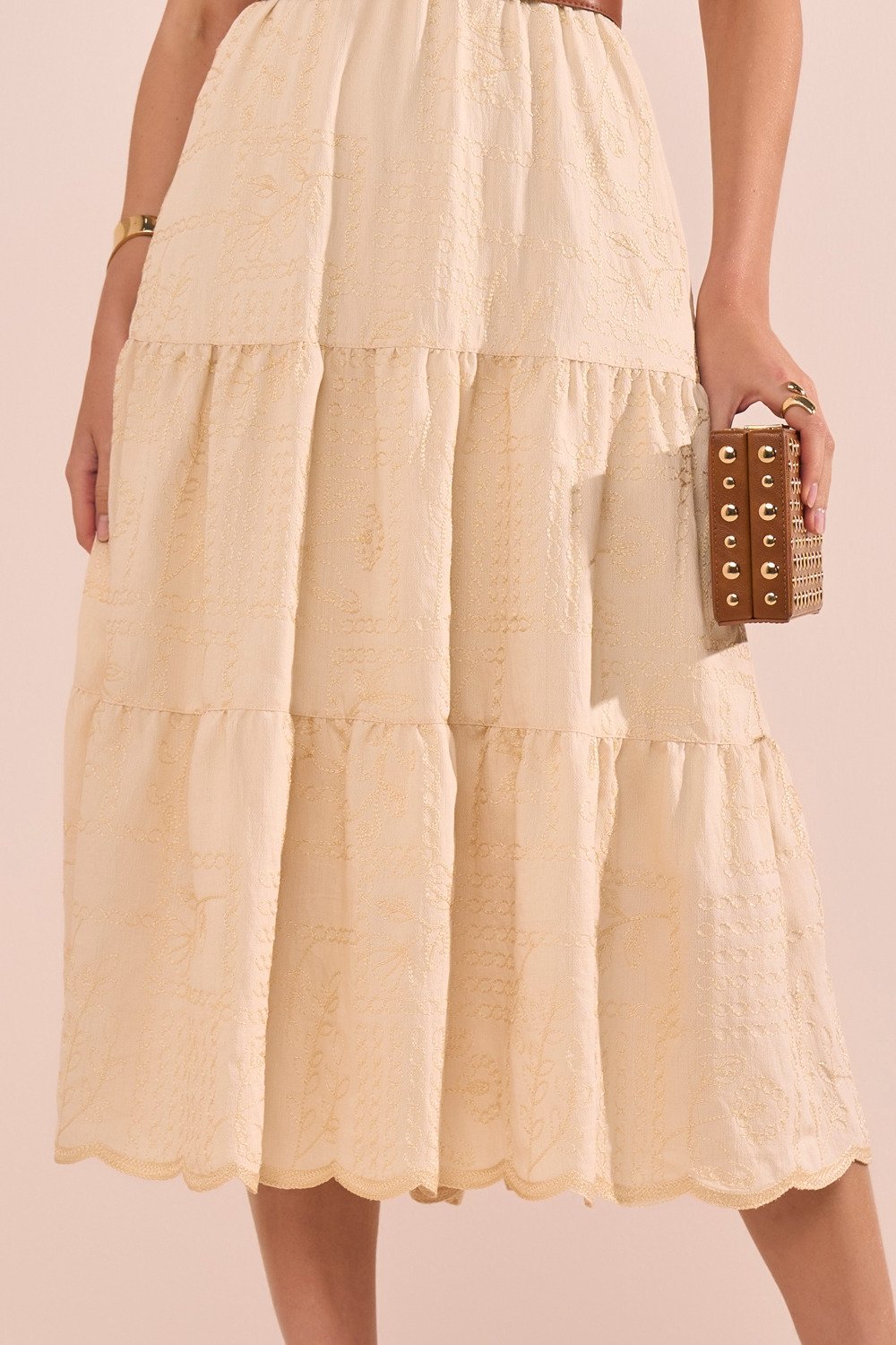 Produzido em viscose bordada em relevo, o vestido combina leveza, frescor e textura sofisticada. A viscose permite respirabilidade e movimento, sendo ideal para os dias mais quentes. A peça conta com forro interno, o que garante maior conforto e segurança ao vestir.