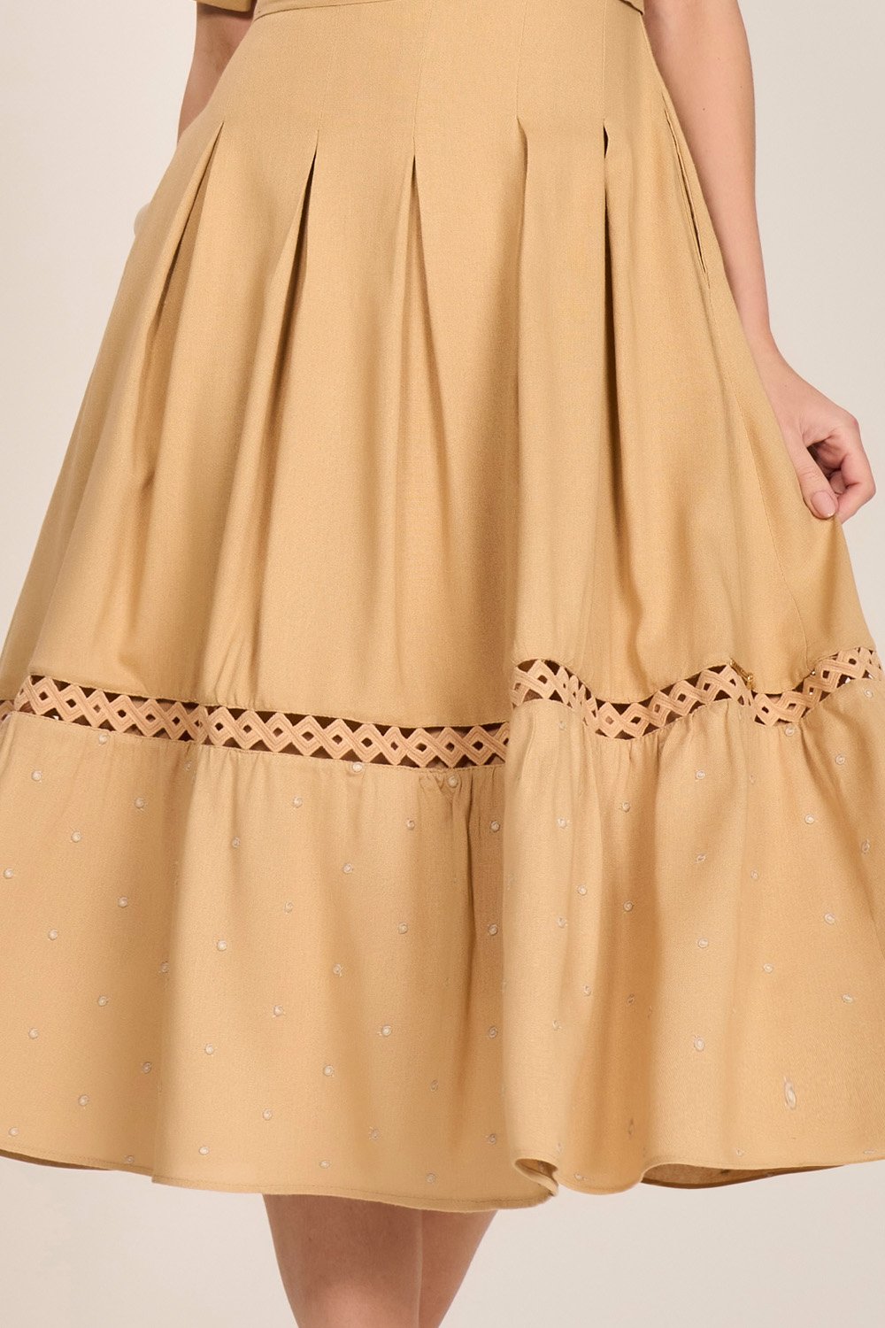 Feito em linho com bordados em poá, o tecido apresenta textura charmosa e acabamento sofisticado. Seu toque é agradável e o caimento confere estrutura sem perder a leveza. A peça é forrada na medida certa para conforto e elegância em qualquer ocasião.