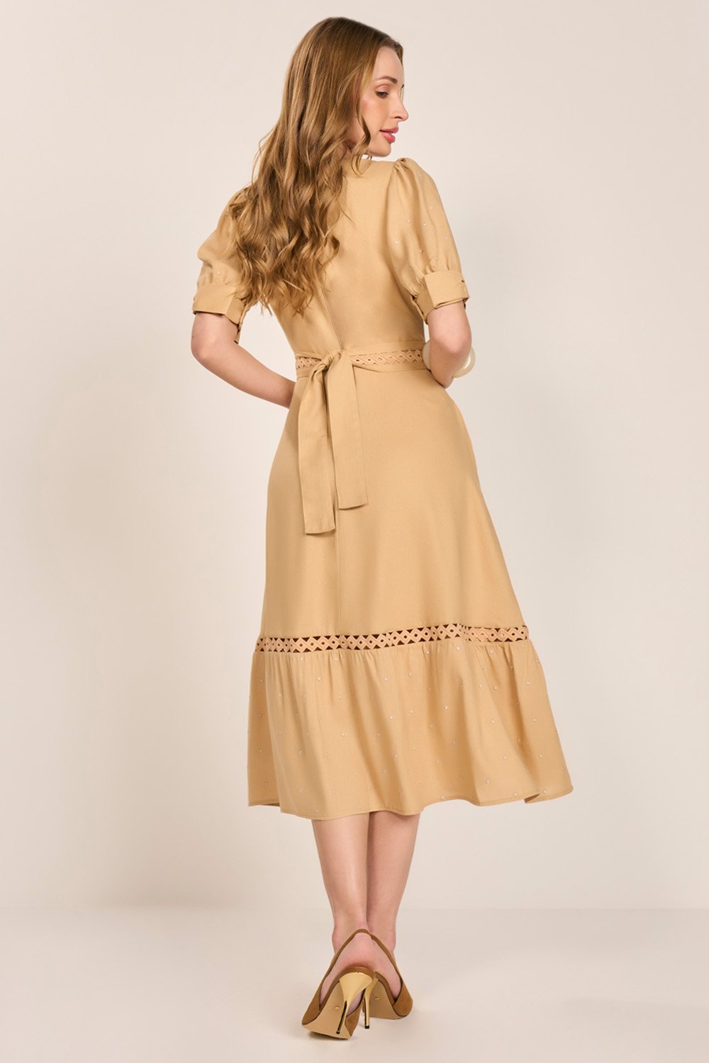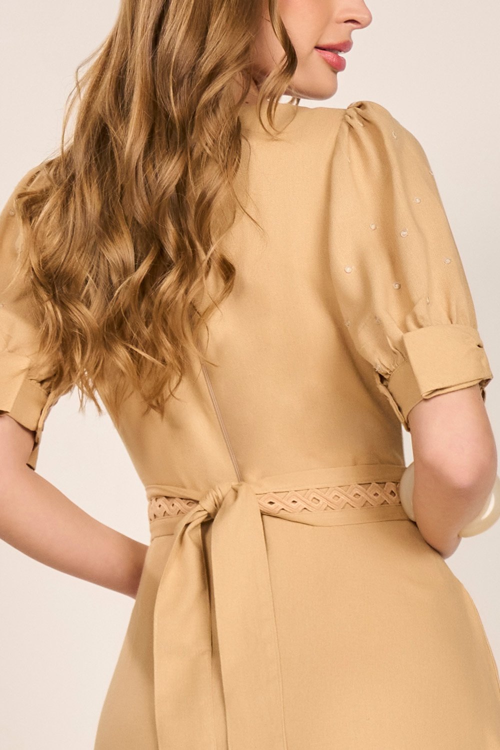 Este vestido é a definição de elegância romântica. As mangas levemente bufantes com laço nos punhos trazem delicadeza, enquanto o corpo é valorizado pelos recortes e detalhes em guipir vazado. Os bolsos funcionais e o cinto faixa com entremeios arrematam o look com estilo e feminilidade.