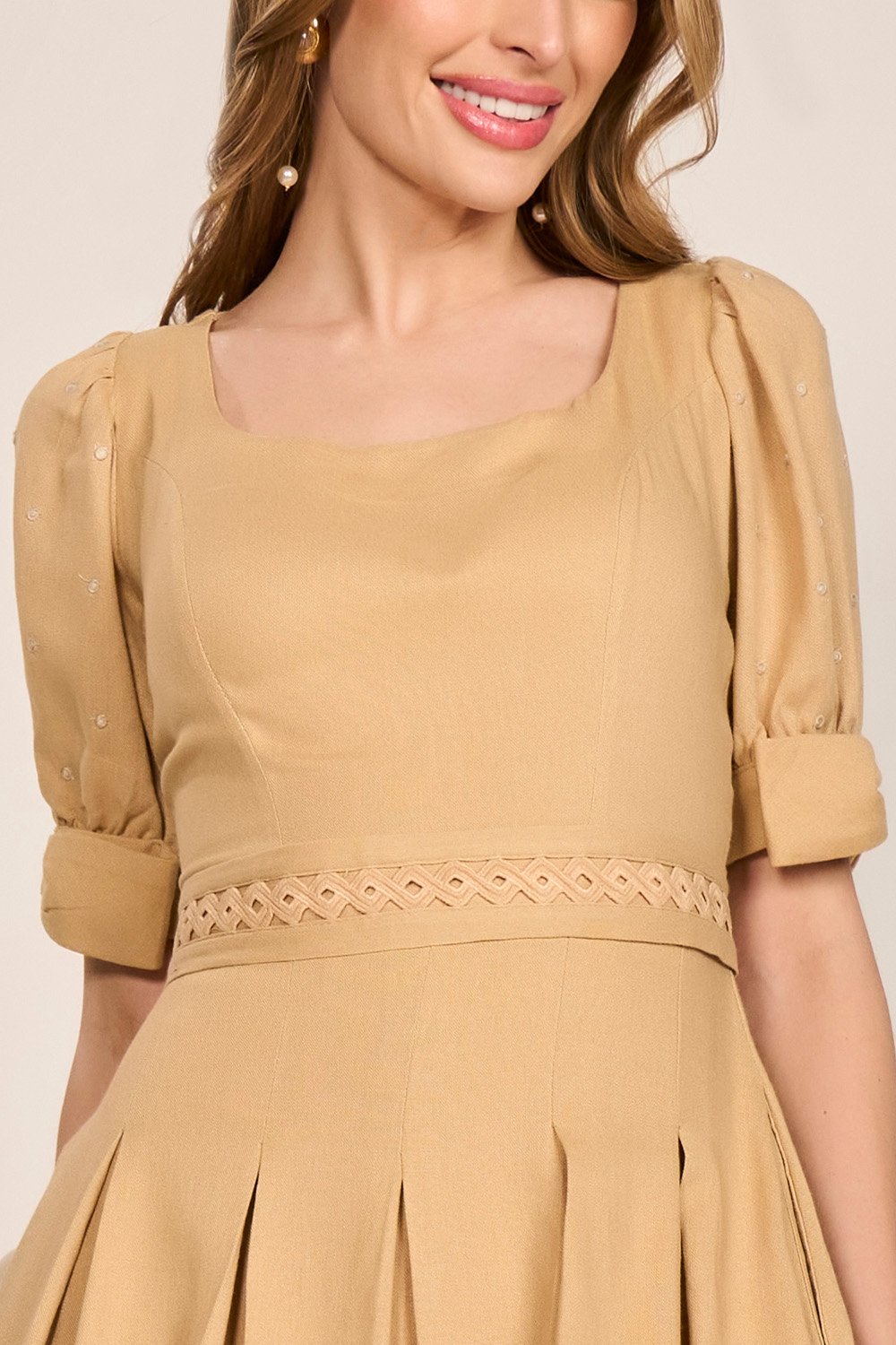 O uso do guipir em recortes estratégicos valoriza a silhueta com elegância. A aplicação do laço nas mangas e o cinto faixa combinando tornam o modelo único. Um vestido que transmite delicadeza e requinte em cada detalhe.
