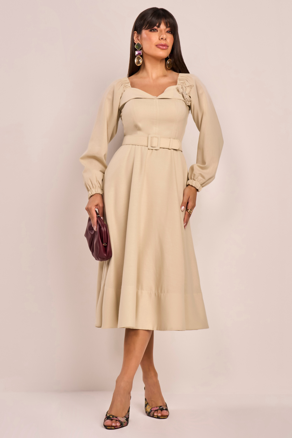 Esse vestido é uma verdadeira obra de arte em forma de look. Com flores bordadas à mão e aplicação de pérolas, ele exala romantismo e sofisticação. A modelagem godê com pregas garante um caimento impecável e muito movimento, enquanto os recortes valorizam a silhueta com delicadeza. Um vestido memorável para mulheres únicas.