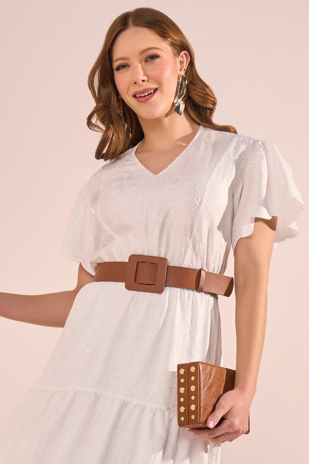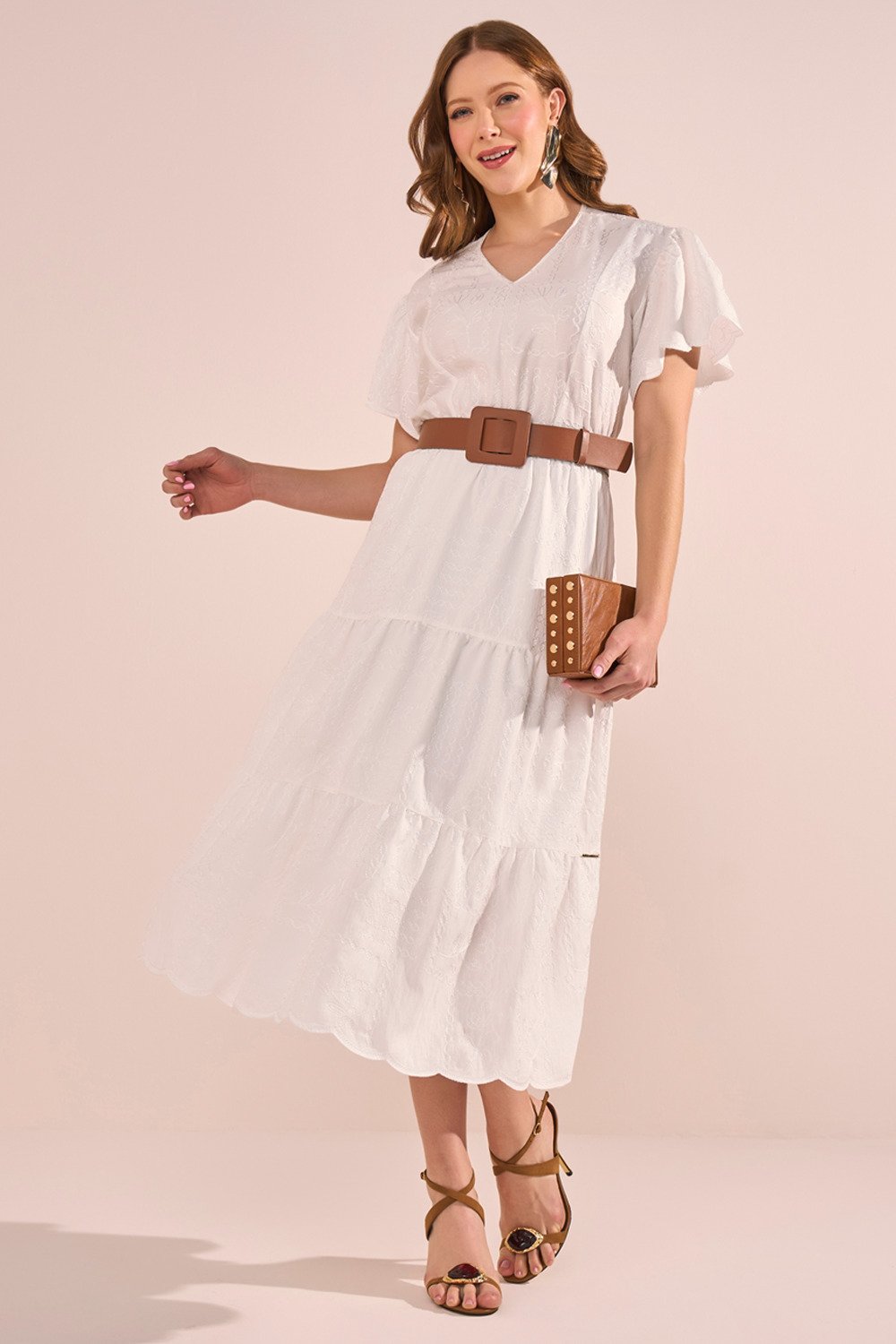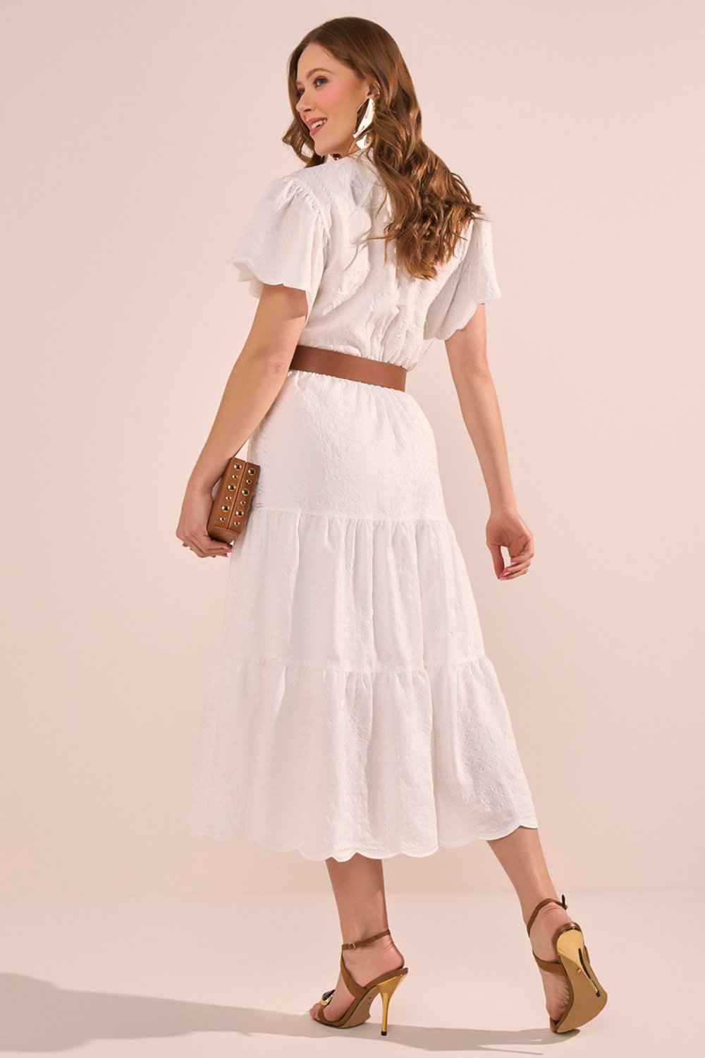 Os bordados em relevo elevam o visual com um toque artesanal elegante. As mangas evasê trazem fluidez e romantismo, enquanto o acabamento da barra demonstra o cuidado nos detalhes da confecção. Uma peça ideal para ocasiões que pedem delicadeza, frescor e presença marcante.
