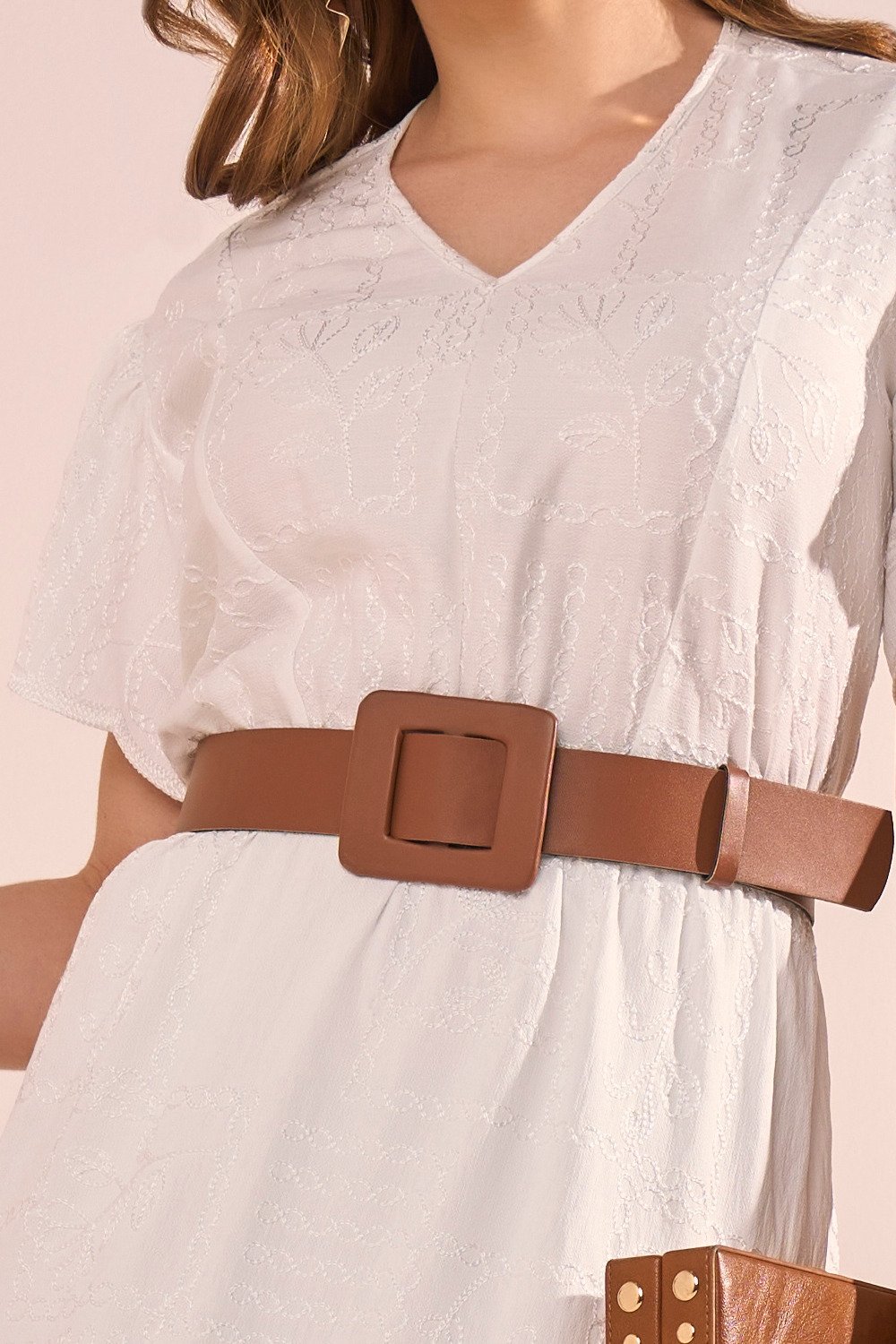 Produzido em viscose bordada em relevo, o vestido combina leveza, frescor e textura sofisticada. A viscose permite respirabilidade e movimento, sendo ideal para os dias mais quentes. A peça conta com forro interno, o que garante maior conforto e segurança ao vestir.