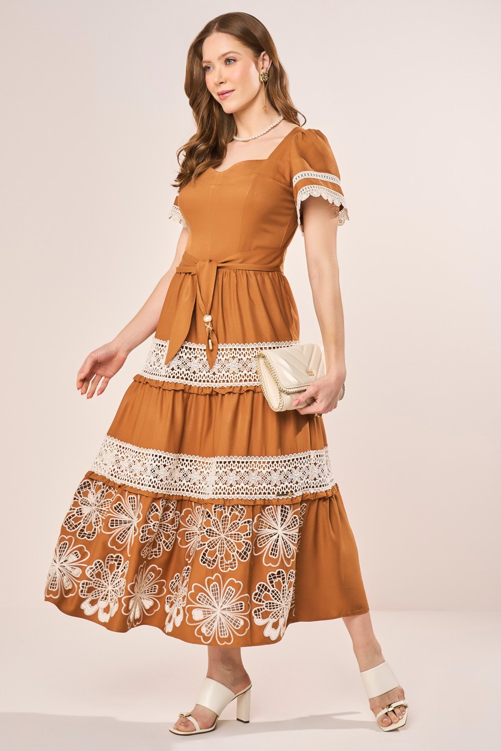 Romântico e atemporal, este vestido traz o encanto dos bordados Richelieu aliados à leveza da viscose. O decote princesa realça o colo com elegância, enquanto as mangas evasê garantem movimento sutil e fluidez. Os detalhes em guipir e os babados na saia criam harmonia visual, tornando a peça perfeita para ocasiões especiais ou eventos diurnos.