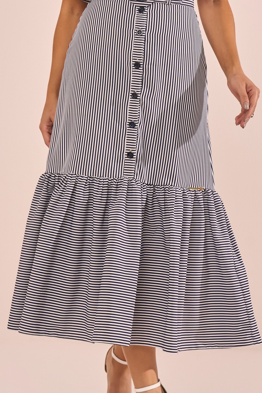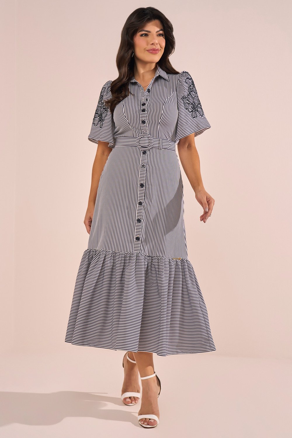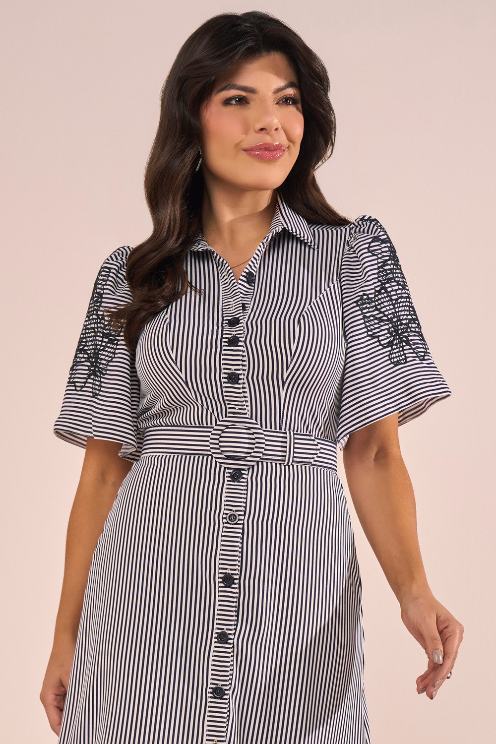 Inspirado na alfaiataria feminina, este chemise traz um ar moderno e delicado. As listras alongam a silhueta, enquanto as mangas evasê adicionam leveza. Os bordados industriais em destaque elevam a peça, tornando-a especial. O cinto encapado realça a cintura e finaliza o look com charme.