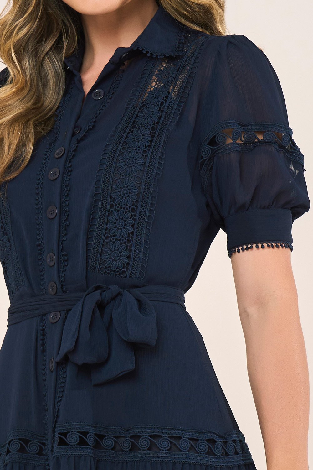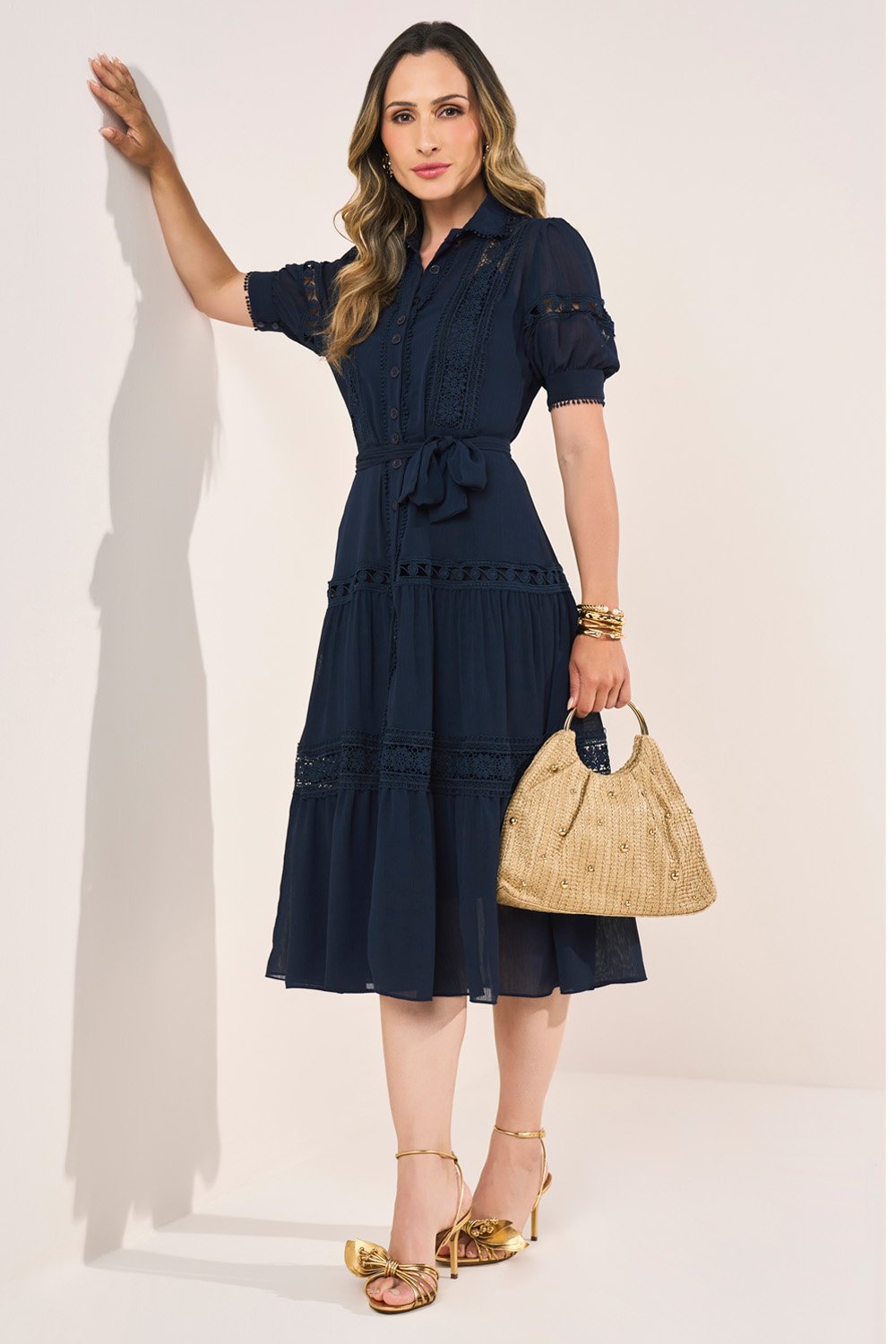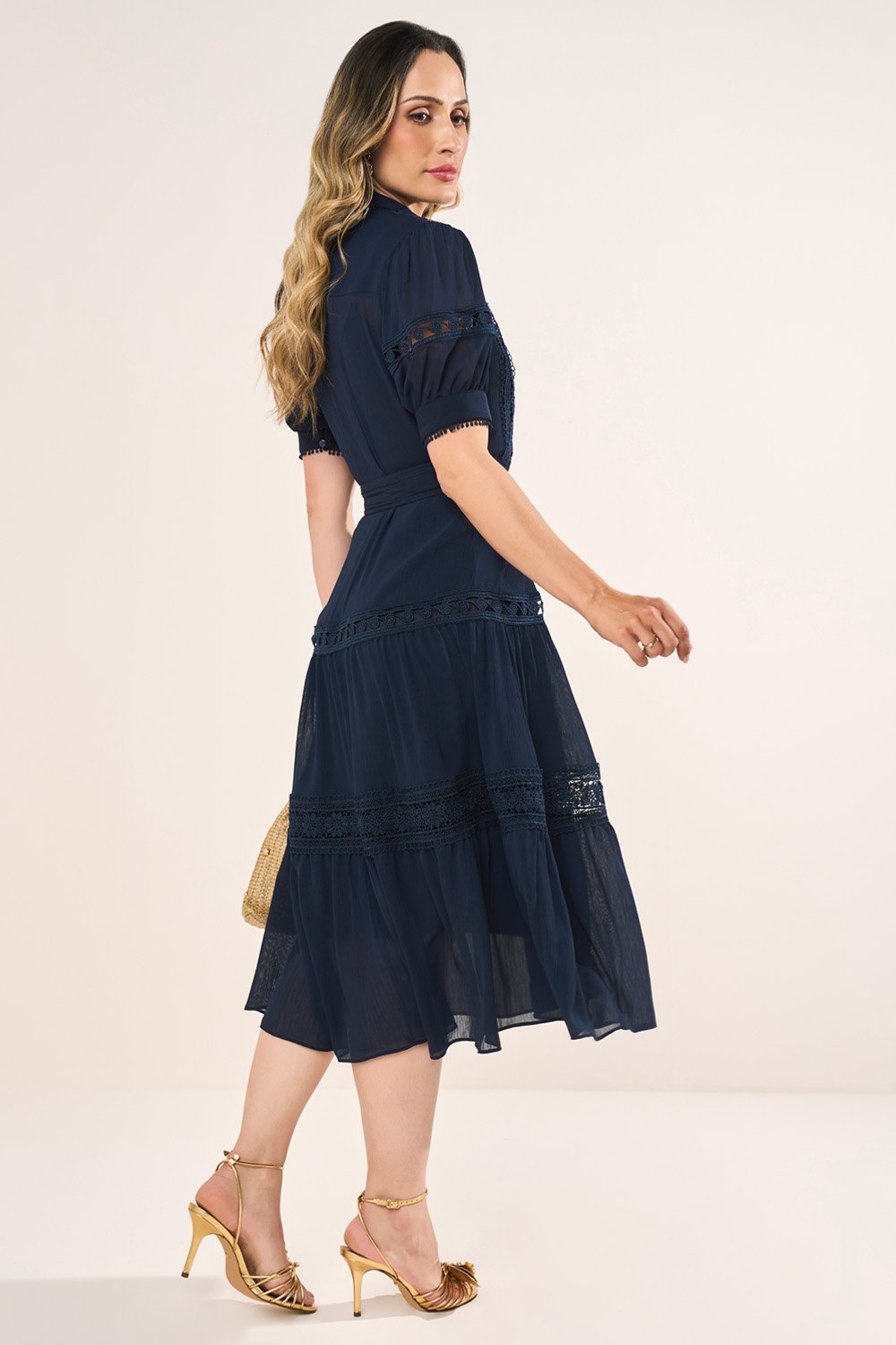 Os recortes com guipir são o ponto alto da peça, destacando a proposta artesanal e elegante. O cinto faixa reforça a feminilidade e a sofisticação, equilibrando charme e praticidade. É um vestido versátil, ideal tanto para eventos sociais quanto para produções elegantes do dia a dia.