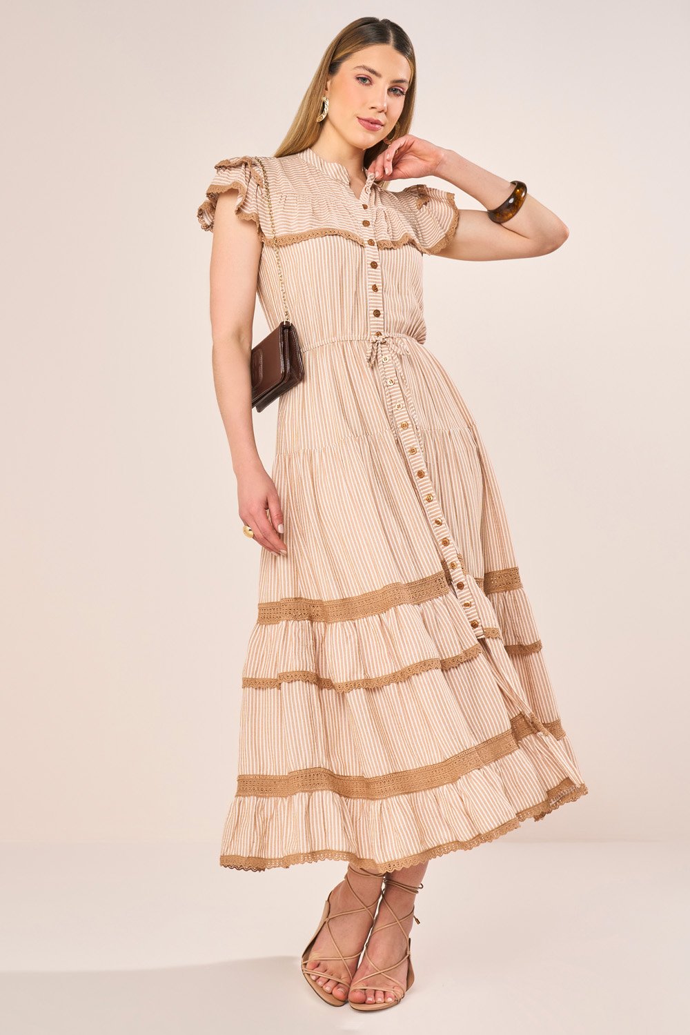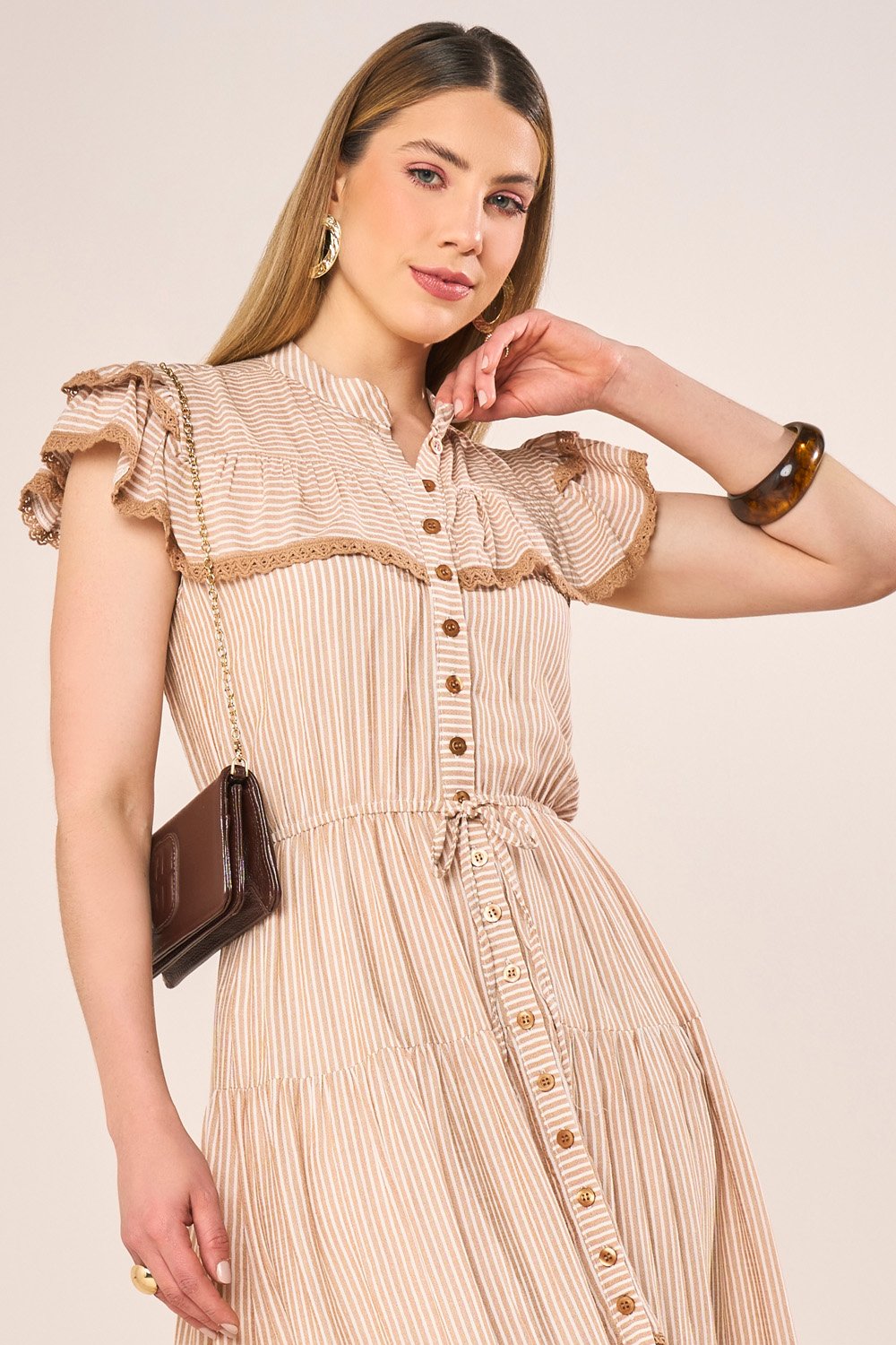 A aplicação de guipir nas marias enriquece o design com textura artesanal. O laço com ponteiras de strass adiciona brilho sofisticado, enquanto o abotoamento frontal facilita o vestir sem perder a elegância característica do chemise. Uma peça charmosa, moderna e perfeita para ocasiões que pedem leveza refinada.