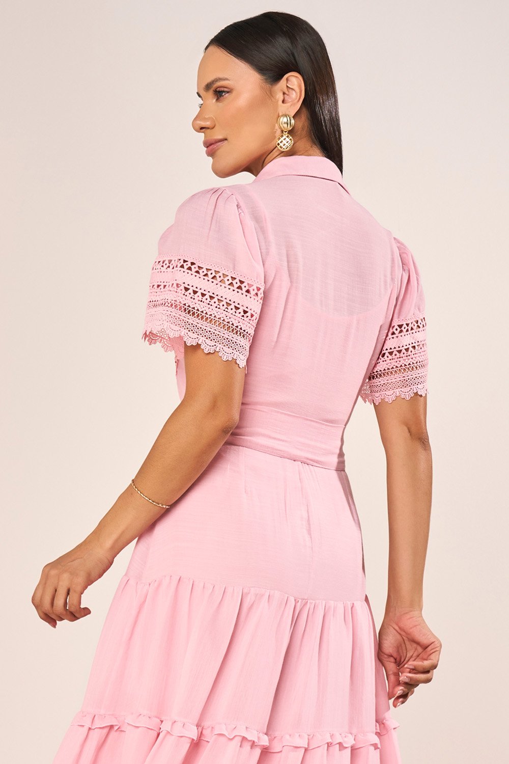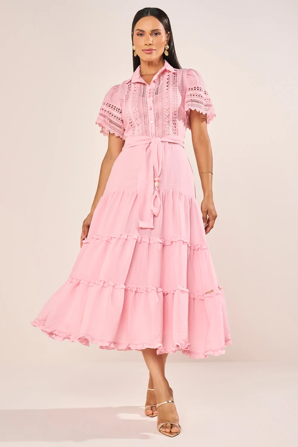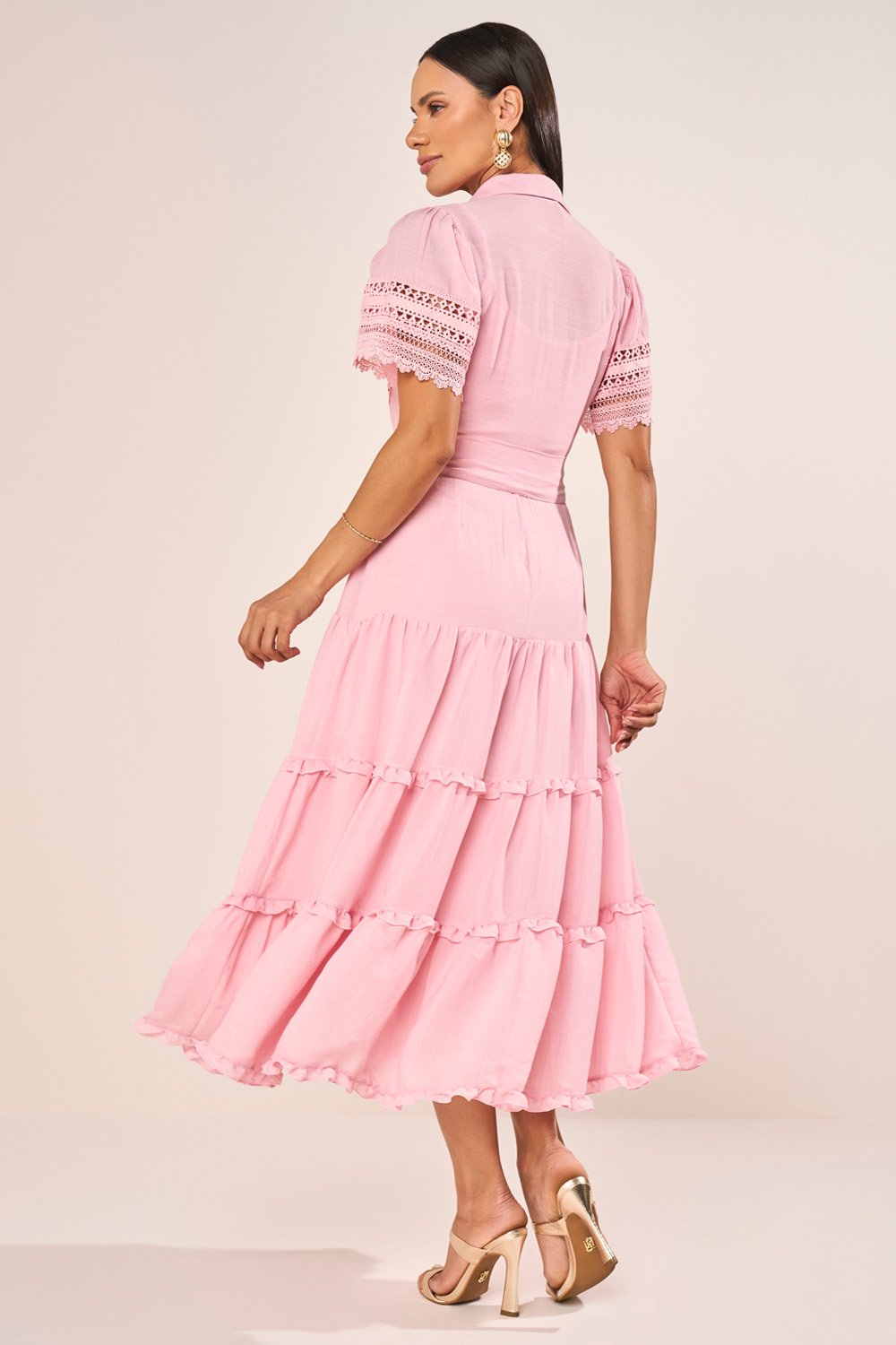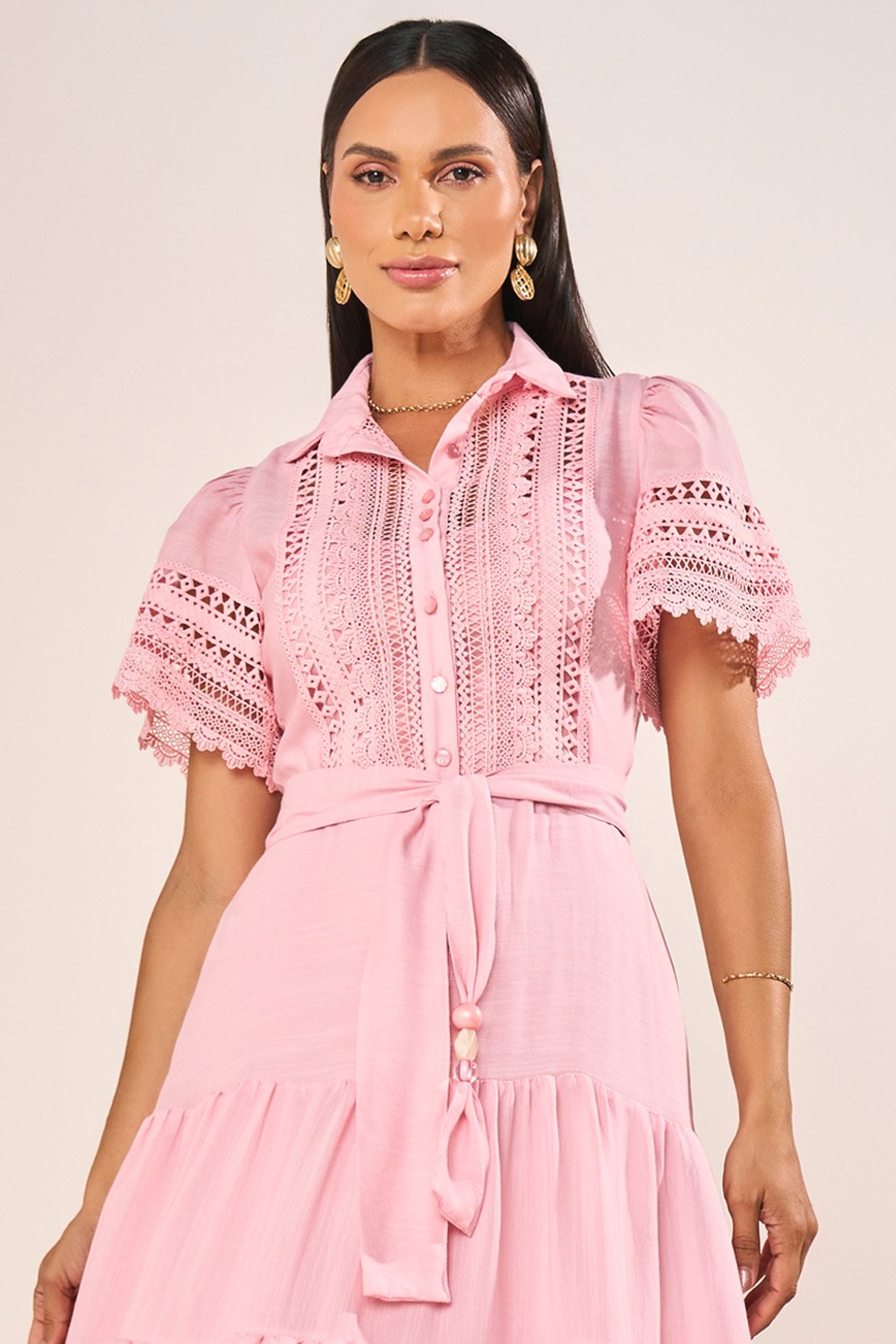 Este vestido chemise em viscose apresenta uma construção sofisticada, combinando a elegância da gola camisa com o charme das mangas evasê realçadas por delicados acabamentos em guipir. A saia em marias, suavemente marcada por mini babados, acrescenta movimento gracioso e feminilidade na medida certa. O cinto faixa com ponteiras resinadas completa o visual, permitindo ajuste refinado na cintura e reforçando a estética clássica e atual da peça. Acompanha combinete que oferece acabamento impecável ao vestir.