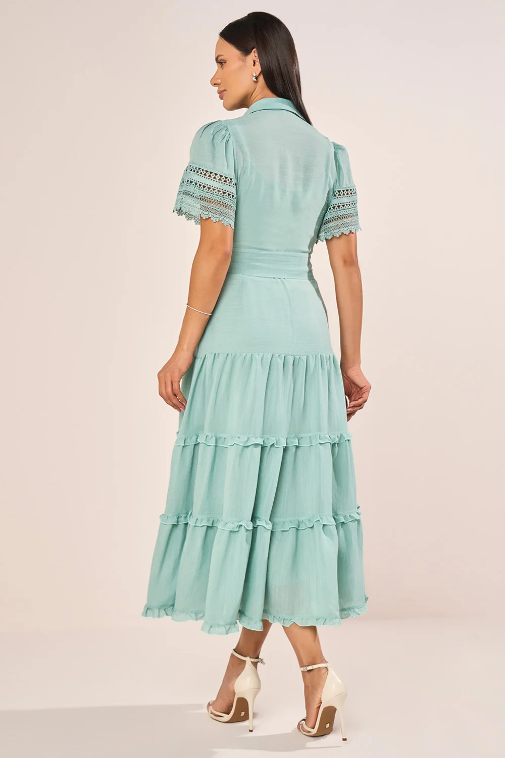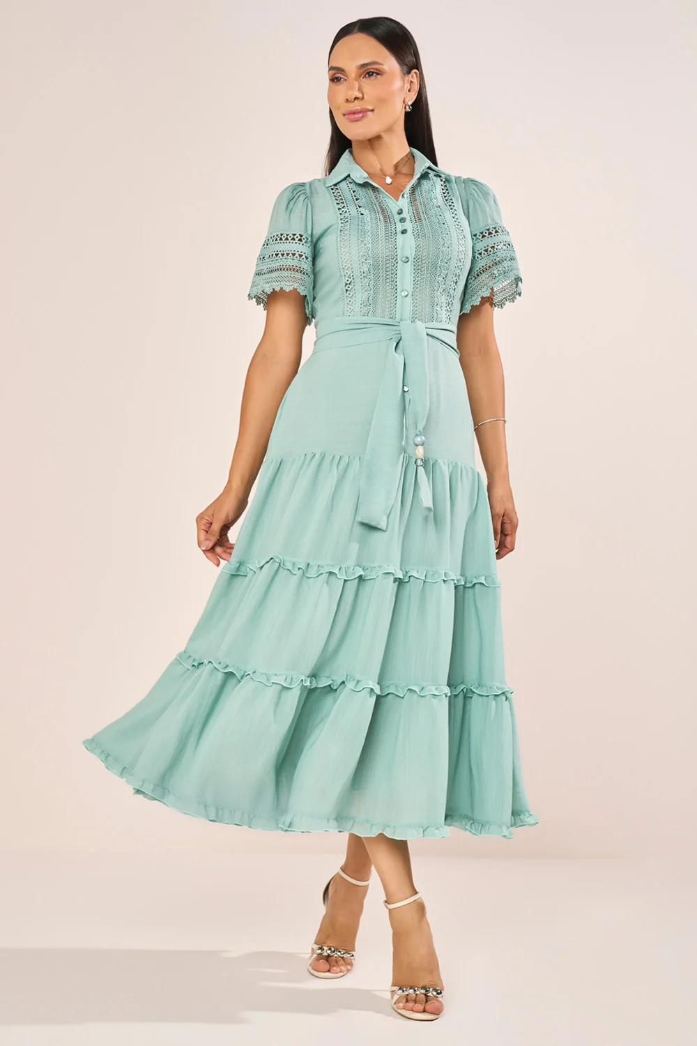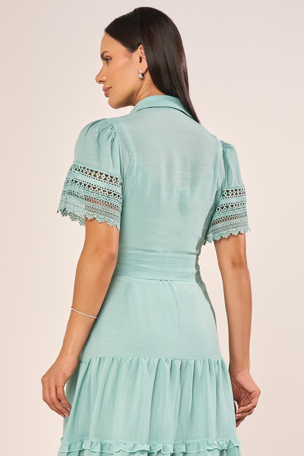 Este vestido chemise em viscose apresenta uma construção sofisticada, combinando a elegância da gola camisa com o charme das mangas evasê realçadas por delicados acabamentos em guipir. A saia em marias, suavemente marcada por mini babados, acrescenta movimento gracioso e feminilidade na medida certa. O cinto faixa com ponteiras resinadas completa o visual, permitindo ajuste refinado na cintura e reforçando a estética clássica e atual da peça. Acompanha combinete que oferece acabamento impecável ao vestir.