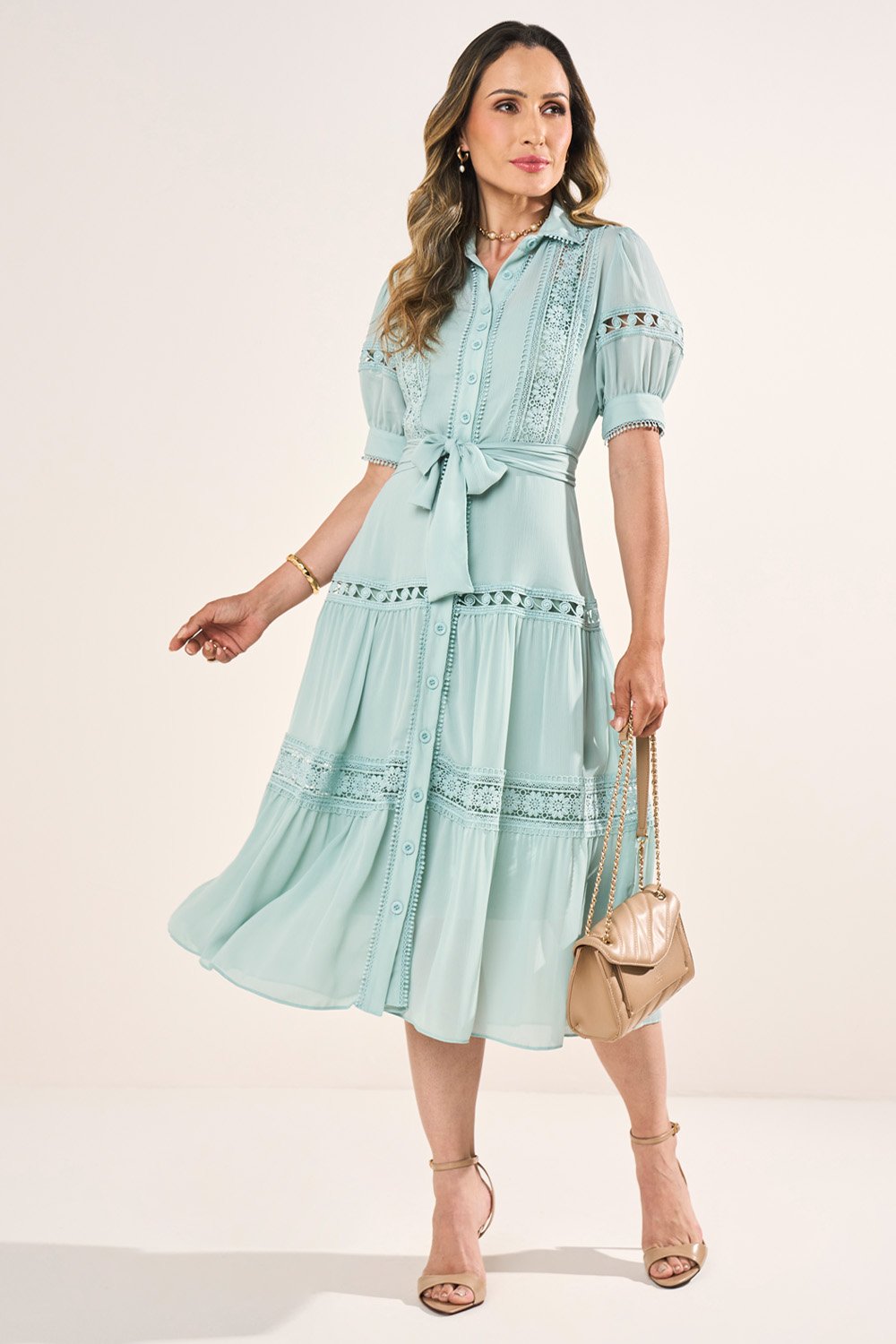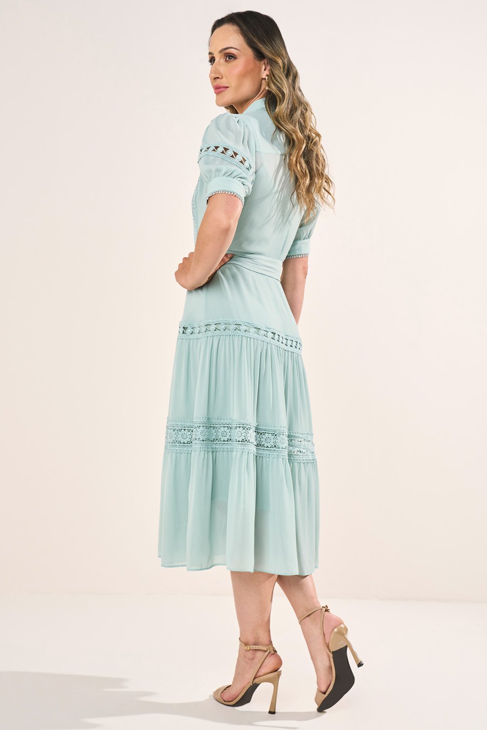 Os recortes com guipir são o ponto alto da peça, destacando a proposta artesanal e elegante. O cinto faixa reforça a feminilidade e a sofisticação, equilibrando charme e praticidade. É um vestido versátil, ideal tanto para eventos sociais quanto para produções elegantes do dia a dia.