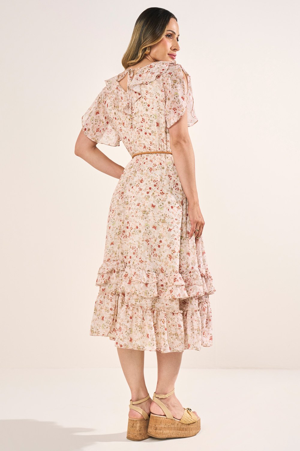 Este vestido midi em crepe combina estampa floral com detalhes que reforçam o romantismo. O decote com babados adiciona delicadeza, enquanto a amarração nas costas com ponteiras de metal garante ajuste sofisticado. A saia com babados complementa o design fluído, e o cós com elástico oferece conforto sem perder a elegância.